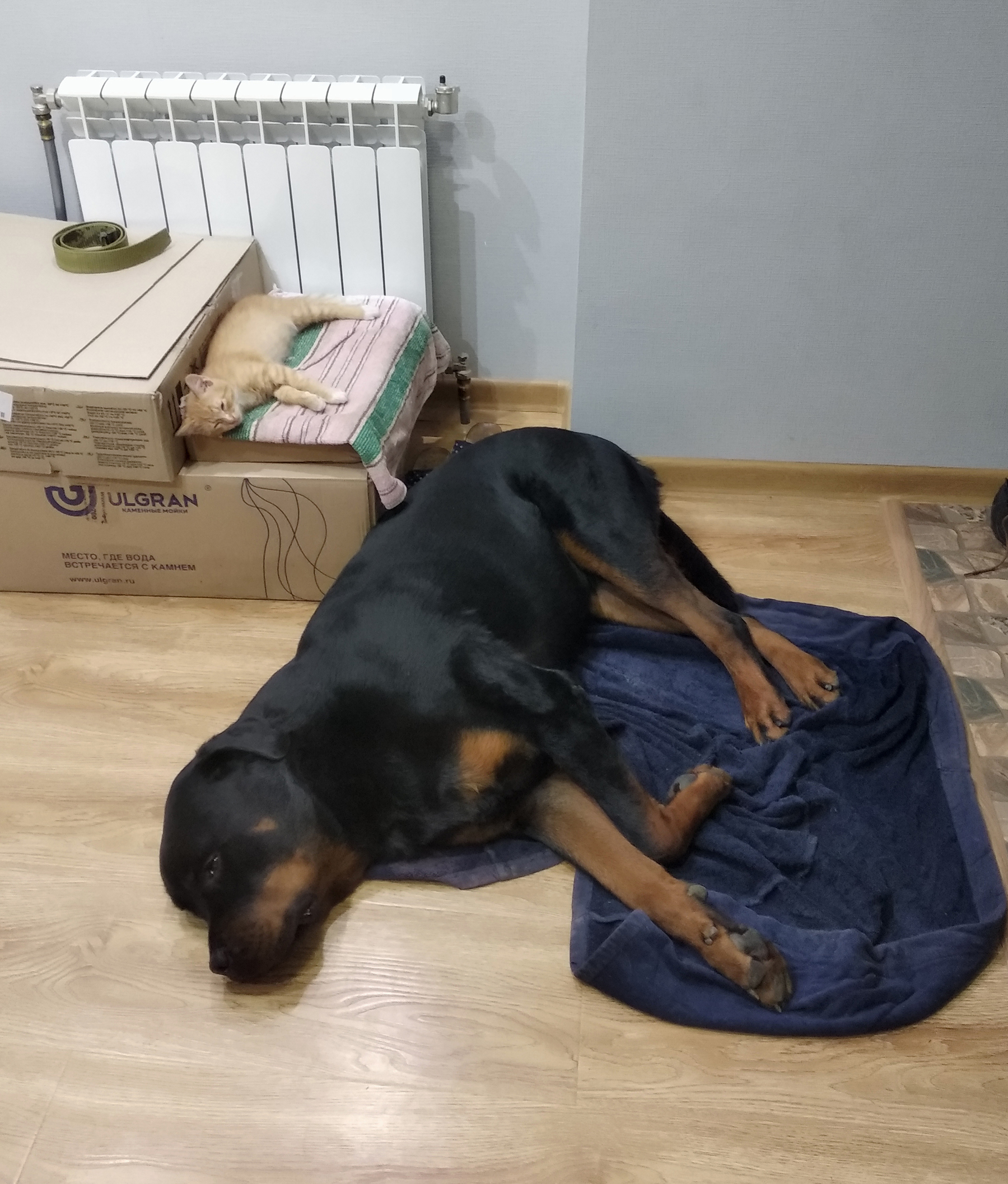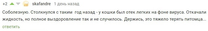 Вчера утром ко мне домой заезжал ветврач и осмотрел его. Сказал что вероятнее всего у него отек легких. Назначил ему уколы. Вчера вечером мне привезли все назначенные ему лекарства из интернет магазина, и я думал начать сегодня его лечение. Рентген мы решили ему пока не делать (у меня, у самого со здоровьем уже тоже давно не все хорошо) и мы подумали, что я начну давать лекарства и следить за его дальнейшим состоянием. Но сегодня к утру ему стало хуже и всё пошло по худшему из возможных варианту. Позвонил знакомому и привели его в ветклинику. Там ему сделали рентген, но он не получился и его стали делать второй раз. Потом ему сделали укол и хотели уже подключить к кислороду, но сердце его не выдержало и остановилось. Вернуть снова его к жизни, к огромному сожалению, у врачей уже не получилось. (((((