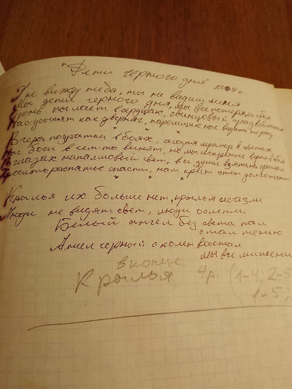 Так что это песня по мотивам тех событий. Не шансон😁. Я старый рокер и сегодня это grunge композиция на мои слова. Прикрепляю фото оригинального текста из той самой тетради. Я брал её в моменты, когда мне было дико х*во. Текст и жанр это от части передаёт, по этом это так рвано и грубо - это не для шоу, это для терапии. Это сложно объяснить, это нужно чувствовать. Правда это ранняя версия текста, потом он немного менялся. (трек не прикрепил я тупо не понял что на этой замечательной площадке этого не сделать, всё в тг)