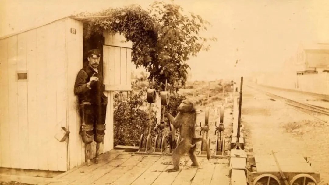 6. Бабуин по кличке Джек 9 лет работал официальным сигнальщиком на железной дороге в Южной Африке в конце 19 века. Его хозяин, сигнальщик Джеймс Уайд, потерял ноги и купил обезьяну в помощники. Джек научился переводить стрелки поездов по звуковым сигналам. За все 9 лет службы бабуин не совершил ни одной ошибки. Ему платили 20 центов в день и полбутылки пива в неделю.