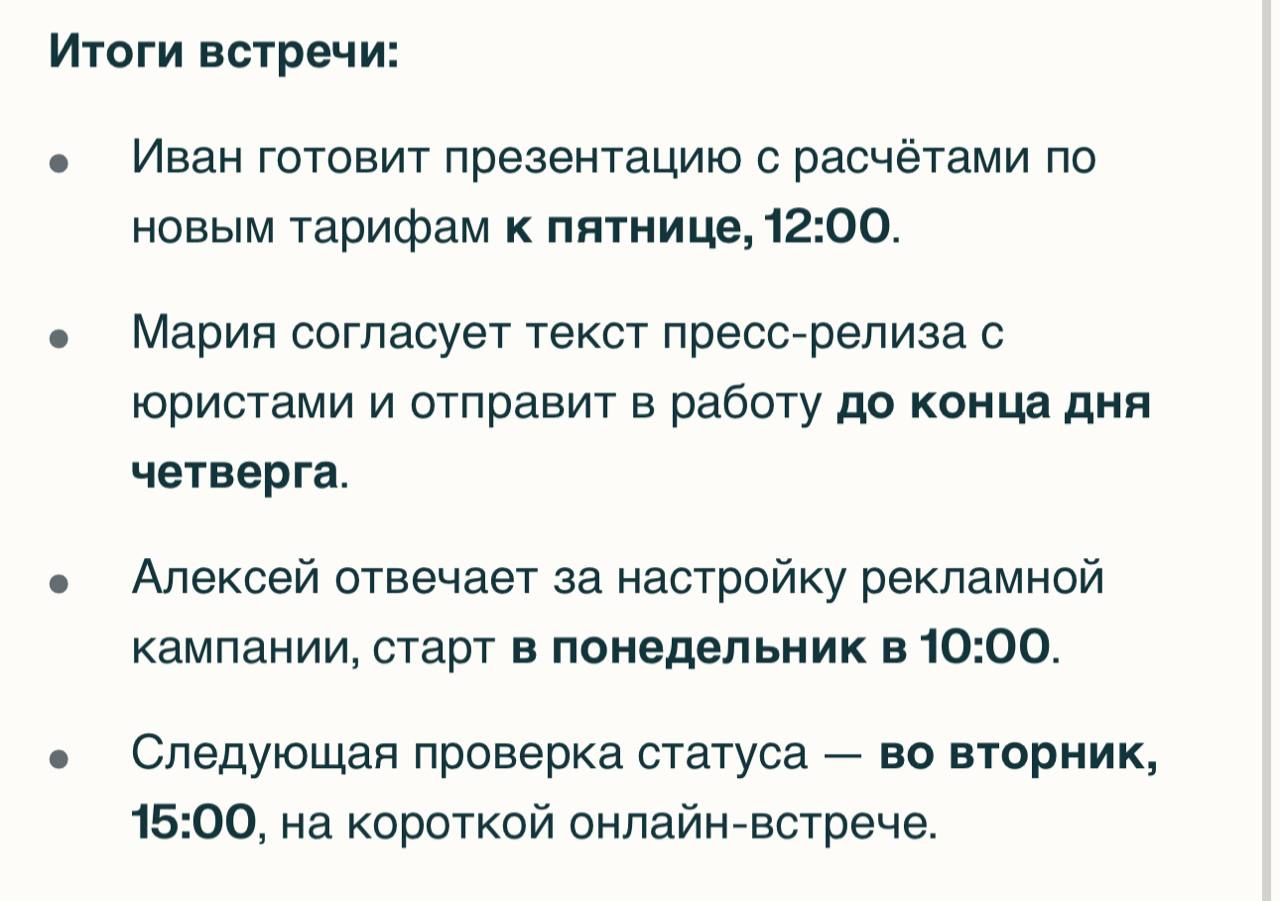 В конце каждого собрания обязательно подведите итог, сформулировав договорённости через конкретные критерии результата — кто, что и к какому сроку должен сделать. После этого обязательно зафиксируйте эти итоги в общем доступе — в корпоративном чате, по почте или в CRM.