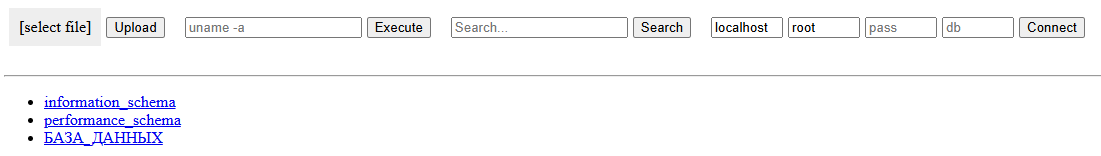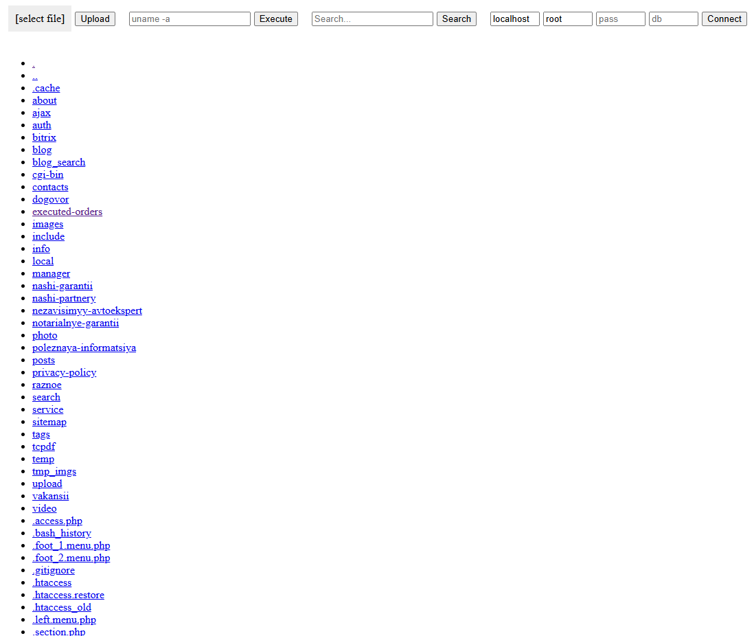 Можно загрузить файл (а также заменить уже существующие файлы), выполнить любую команду, что-то найти, и подключиться к базе данных