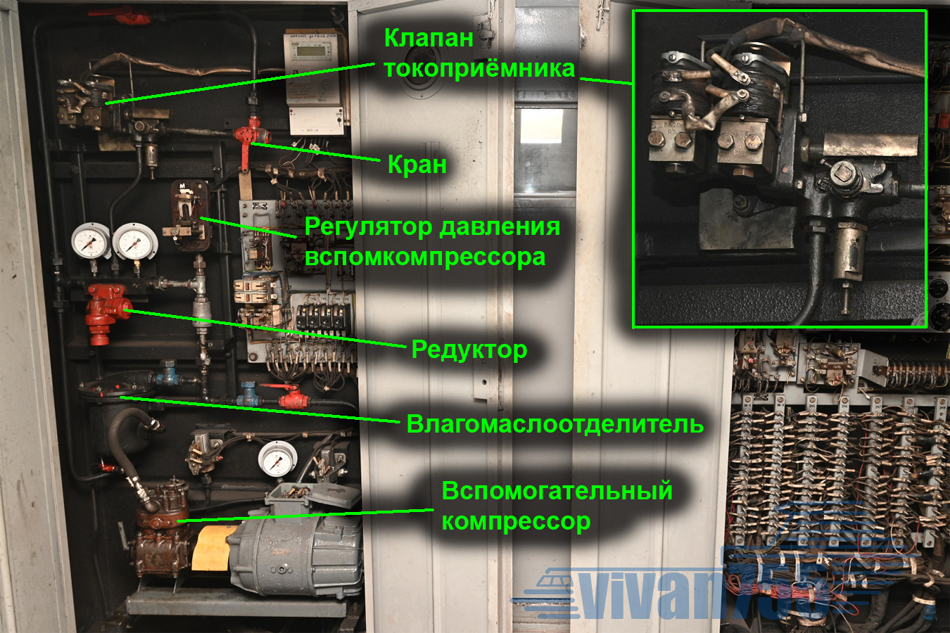 «Фирменное блюдо» здесь – стоящий в самом верху первого шкафа клапан токоприёмника, он же клапан пантографа КЛП: