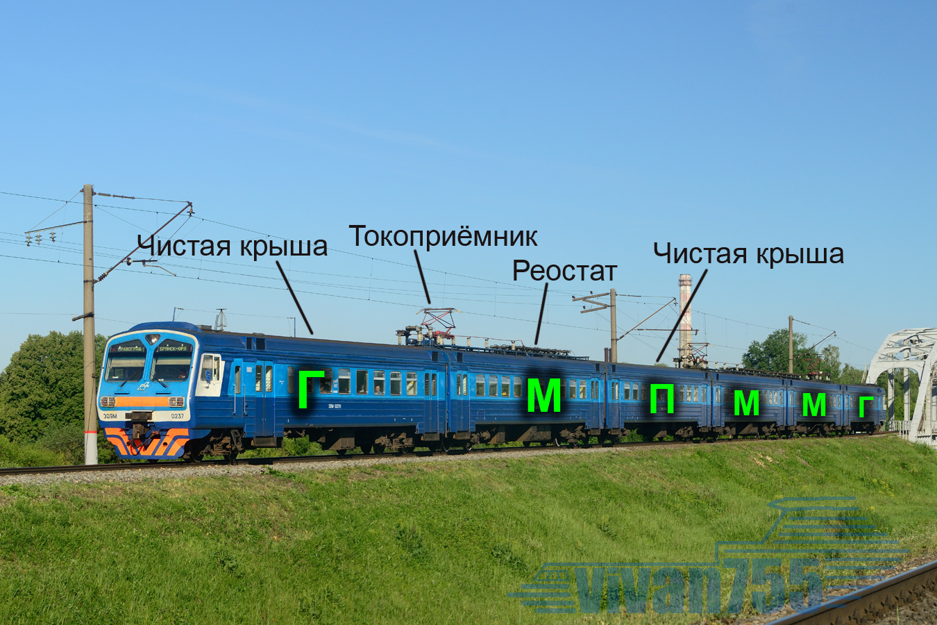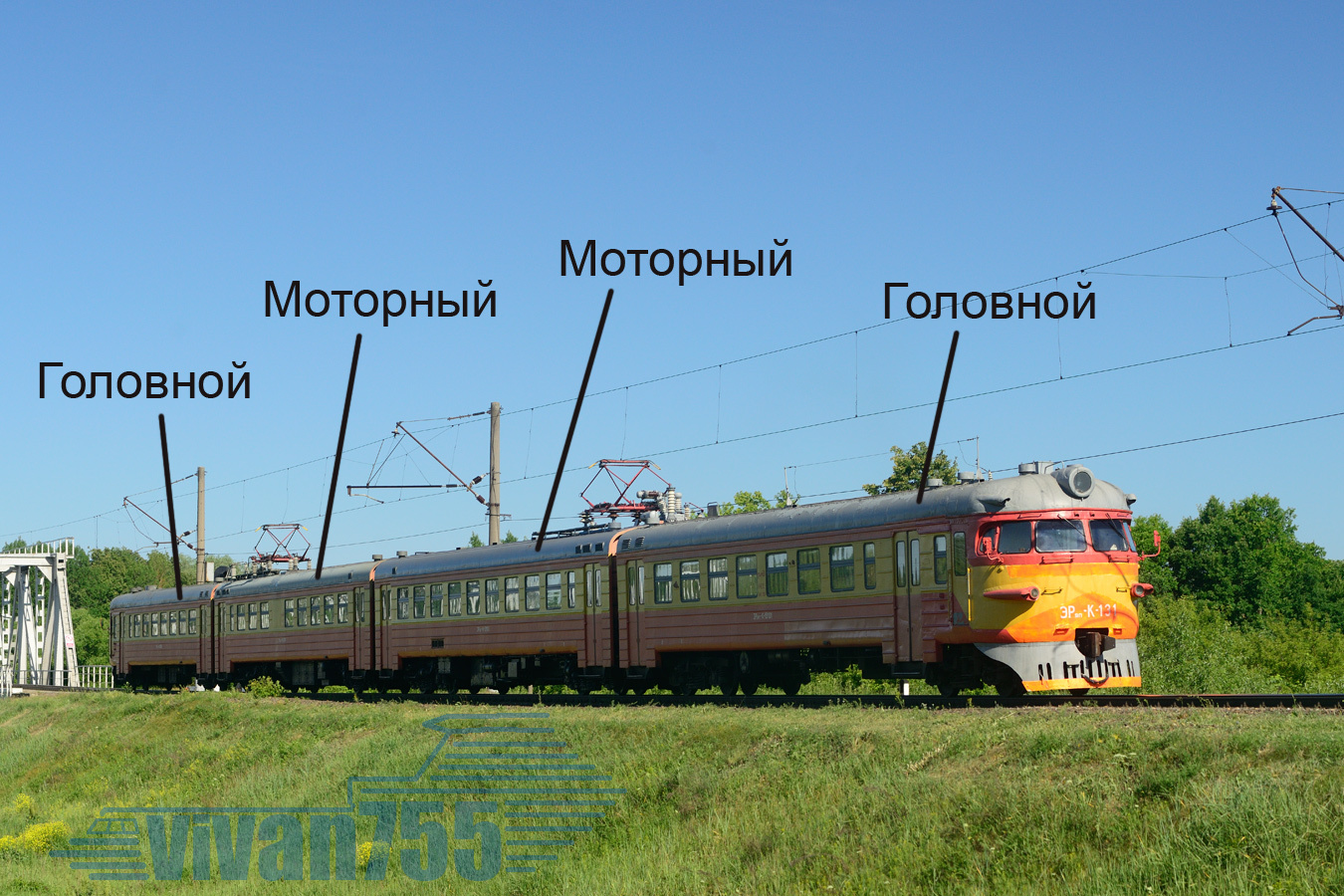 Пассажиры, живущие за пределами двух столиц, наверняка заметили, что классический электропоезд всегда состоит минимум из четырёх вагонов. Если вагонов больше – число их тоже почти всегда чётное. Причём ровно половина вагонов несёт на крыше токоприëмник, у половины его нет. Для распределения массы оборудование распределено по вагонам двух типов – моторным (М) и прицепным (П), вагоны с кабиной называются прицепными головными (Пг) или просто головными (Г).