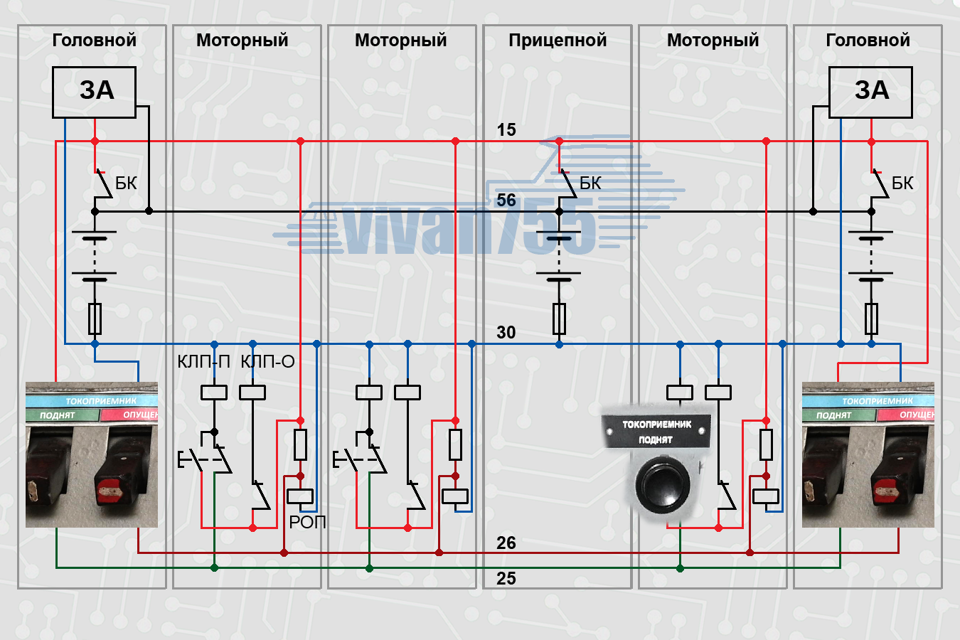 Вот сильно упрощённая схема состава, только с упрощёнными цепями управления токоприёмниками: