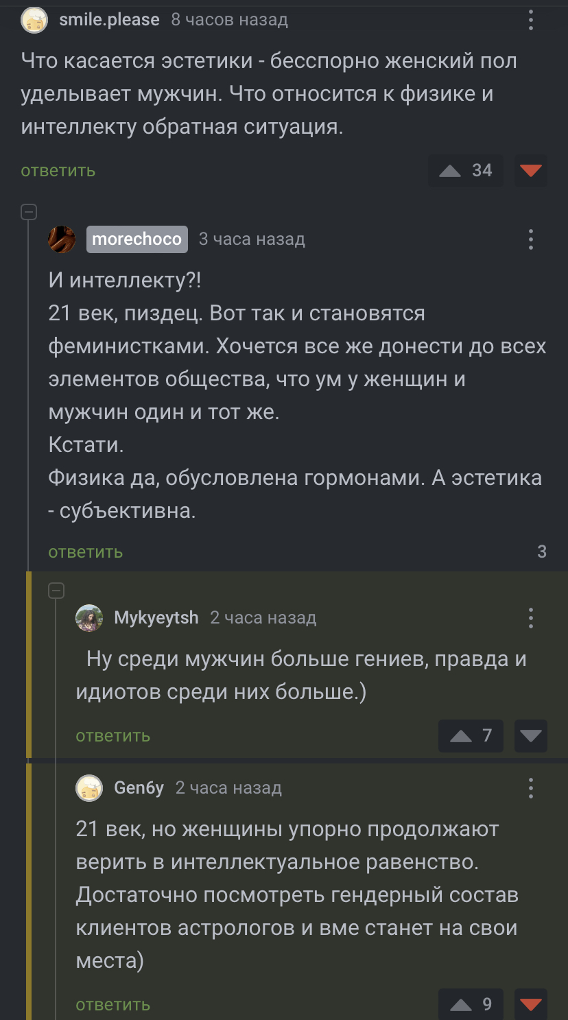 До отключения минусов можно было предполагать, что в среднем люди мыслят здраво. А вот сейчас наглядно видно, сколько людей поддерживают идею и том, что «женщины от природы глупее мужчин».