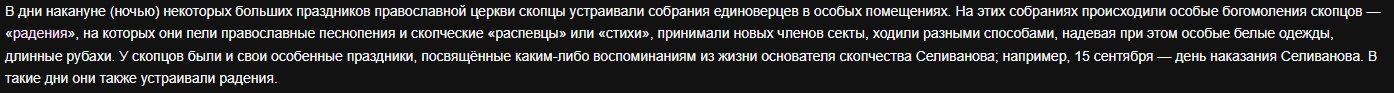 Здесь я возвращаюсь к исходной статье о скопцах в Википедии. После абзаца о женском оскоплении идёт довольно короткая история так называемых радений скопцов: