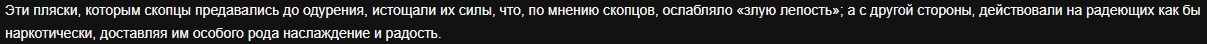 И вот тут мы узнаём, что все эти пляски доставляли скопцам наслаждение и радость. И здесь на ум приходит идея замещающей терапии. Мозг человека периодически нуждается в ярких эмоциях. Сейчас источников таких эмоций просто огромное количество, а в те годы самые яркие эмоции давали только участие в военных сражениях и занятие... сексом. И вот последнего скопцы были лишены. И вероятно этими физическими упражнениями как-то компенсировали занятия сексом. Конечно, эта идея просто сова натянутая на глобус, но ничего лучше в голову не приходит. В других источниках информации о скопцах вообще нет никаких идей о целях и смысле этих плясок. Ну, вот собственно и конец всей моей истории о скопцах.