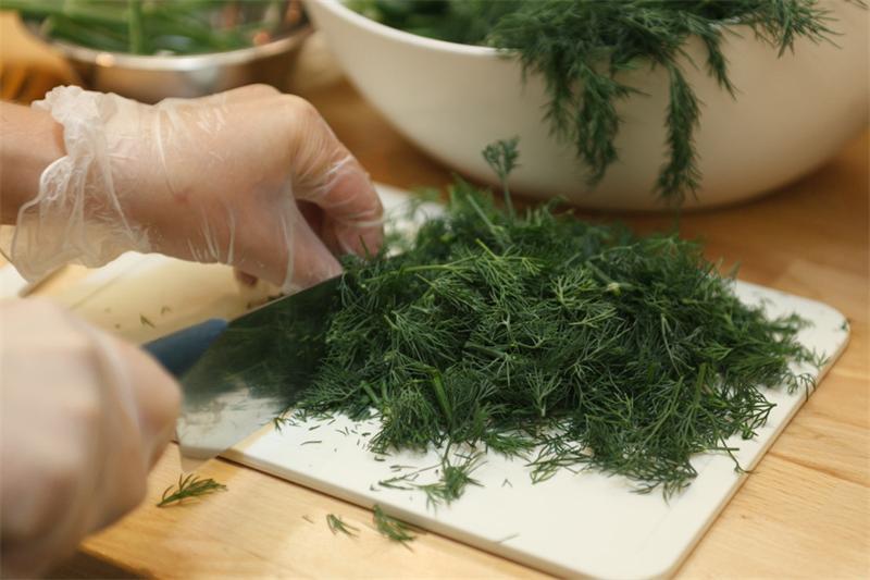 У укропа удалить жесткие стебли, половину нарезать мелко, половину – крупно.