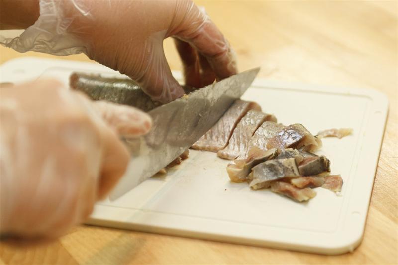 Селедку разделать на филе без кожи и нарезать ломтиками шириной 1-1,5 см.