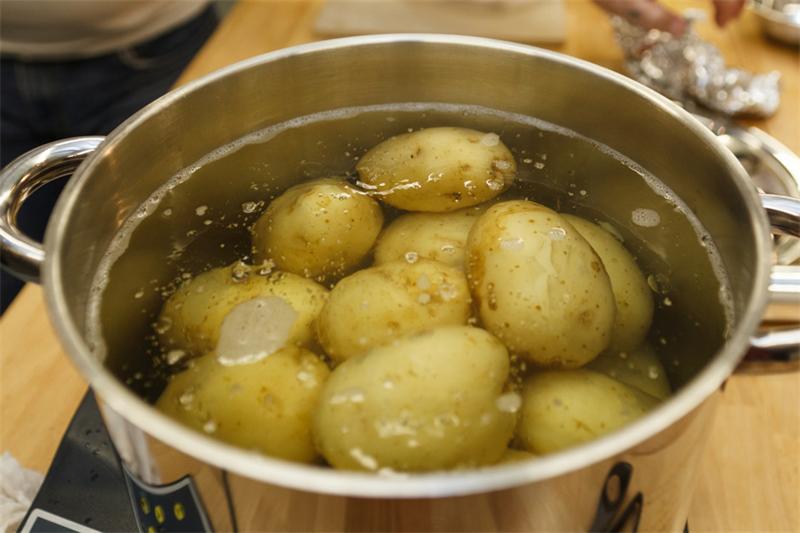 Картофель отварить в мундире 15-20 минут до мягкости. Слить и остудить, затем нарезать вместе с кожей на половинки или четвертинки (если крупный), сбрызнуть уксусом.