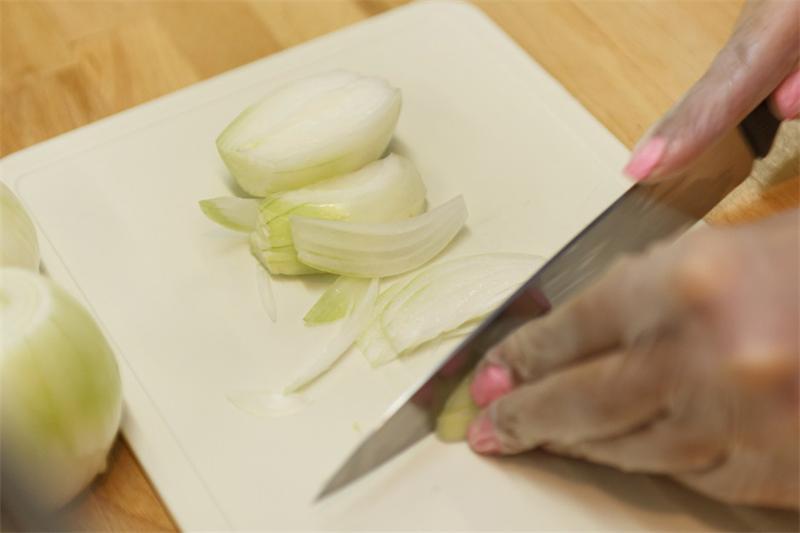 Лук очистить, одну луковицу нарезать перьями, вторую – произвольно крупно.