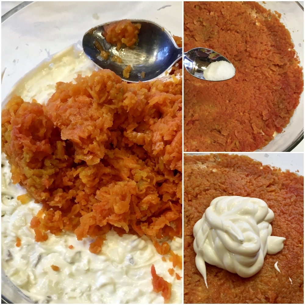 Морковку разровнять, слегка присолить и смазать майонезом. Майонеза можно взять уже немного побольше, чем на смазку картошки. И ровненько его размазать по поверхности.