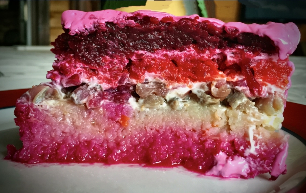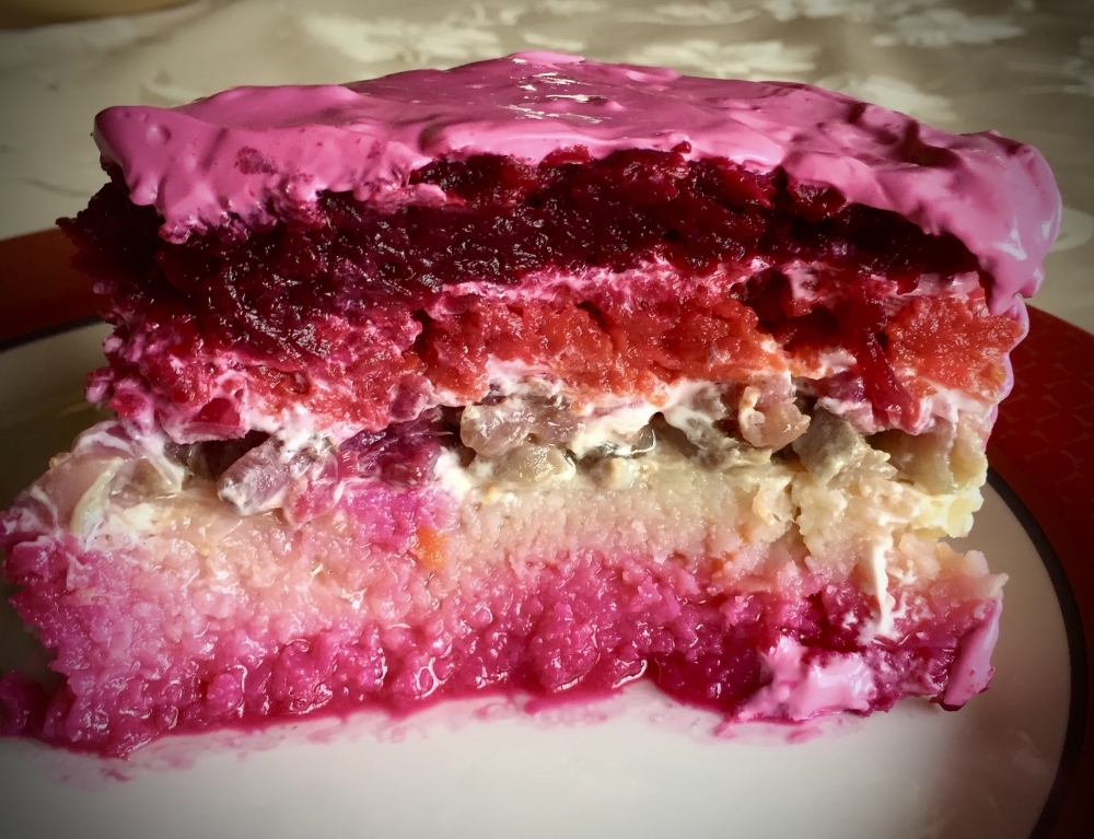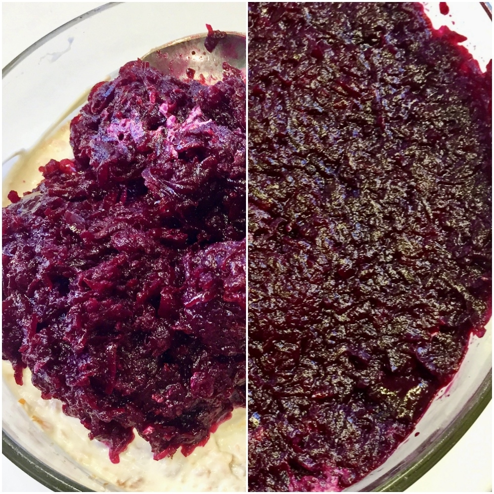 А вот свекольный слой уже можно разделить на два. Между ними нетолстый слой из рубленного вареного яйца очень будет уместен.