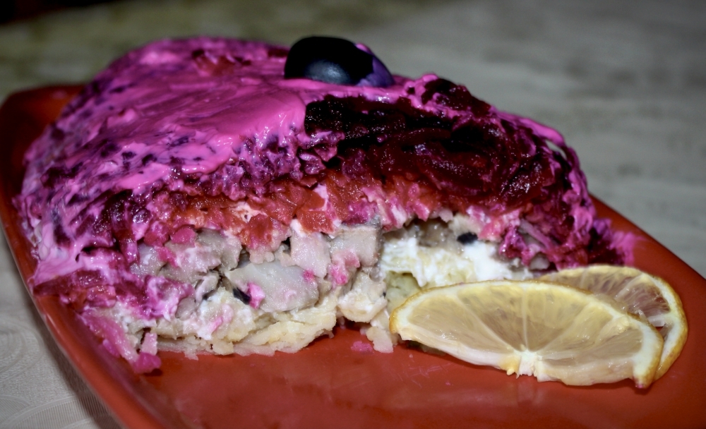 Между морковкой и свеклой можно яблочко добавить кисло-сладкое. И лучше всего его не тереть, а мелко порезать. И тонким слоем. Что называется «в один кружок-кусочек» выложить. Майонезом тоже смазывать не надо.