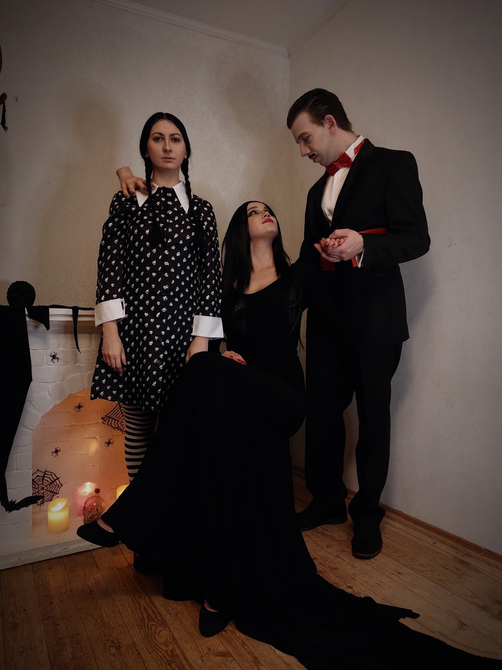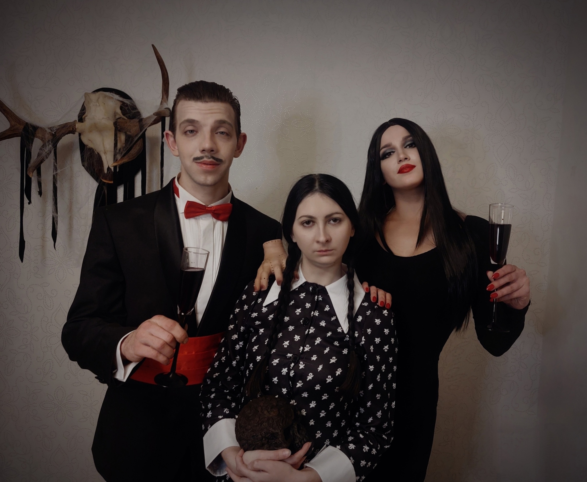 В почти далеком 2023 году нас с мужем и подругой посетила идея попробовать себя в косплее. И вот, что у нас получилось: почти каноничная Уэнздей с замороженной мимикой, неканоничная Мортиша с налетом придури и совсем непохожий Гомес со страхом камеры. Платье старшей Аддамс , кстати, сшито собственноручно.