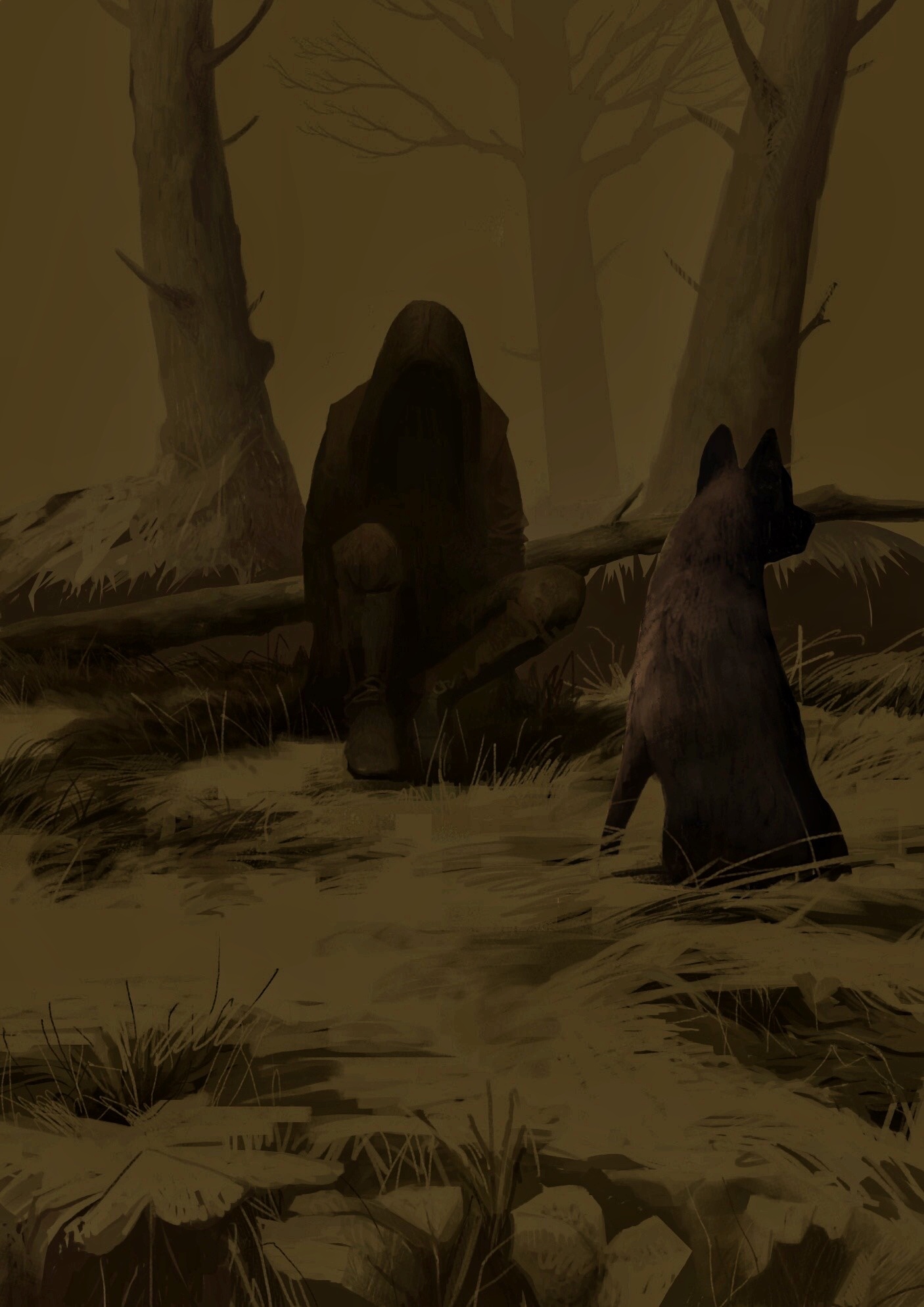В конце концов, после десяти минут блуждания по лесу, пёс вывел паренька к небольшому пню, на котором сидел мужчина в темной, непромокаемой накидке. Голову скрывал капюшон. Сердце Саши екнуло, по телу пробежали мурашки. Собака, тем временем, крутилась вокруг сидящего мужчины и лаяла.