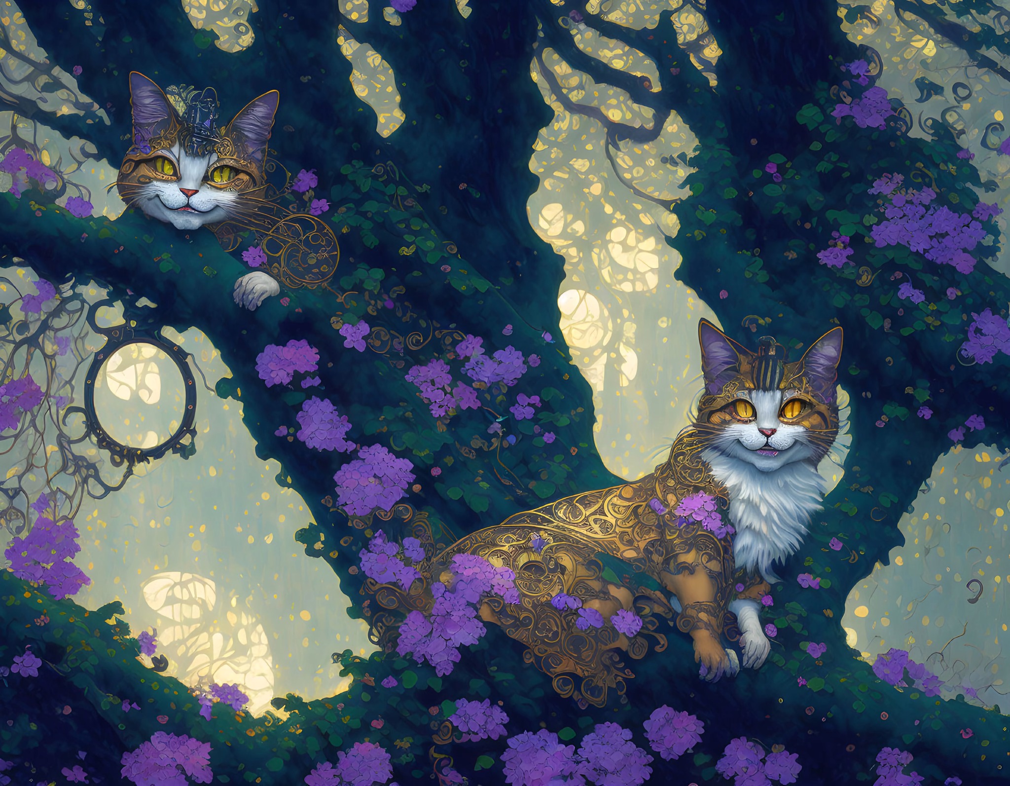Prompt:  The smile of the Cheshire cat appears above a tree branch in the fog. By Egon Schiele, Alphonse Mucha, Gustav Klimt