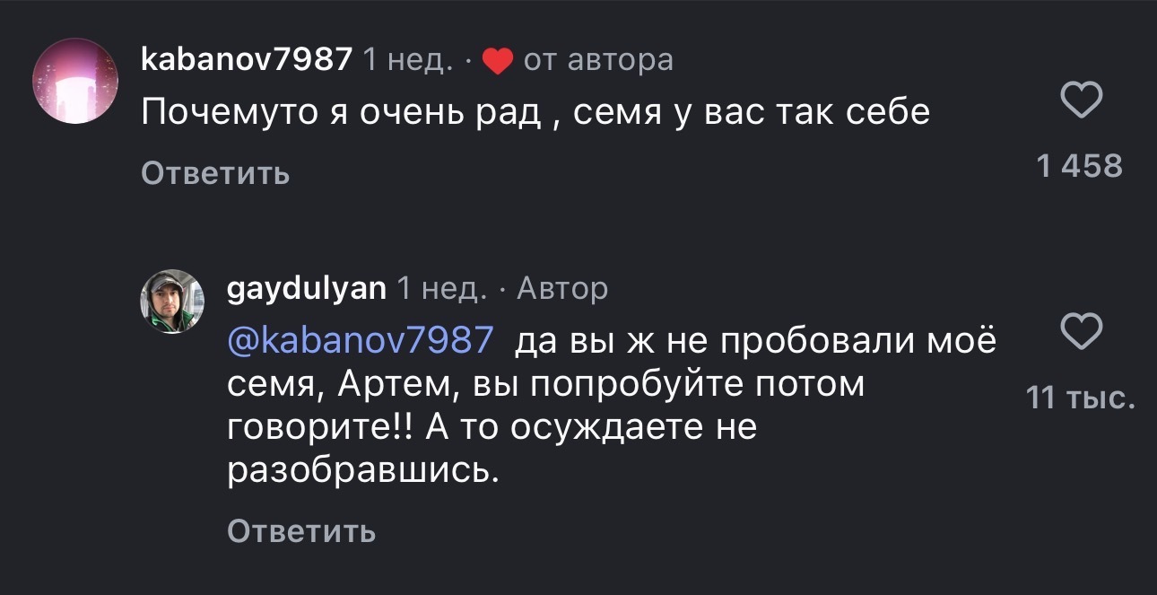 8 YouBrother Семя так себе… 7 дней назад Меня что-то очень повеселил ответ Андрея Гайдуляна в комментариях к его же рилсу про СашаТаня. Да и другим 11 тысячам зашло. И вы подеградируйте со мной. Андрей Гайдулян Сашатаня Скриншот Комментарии Социальные сети Странный юмор Юмор Троллинг 1 Ещё 0