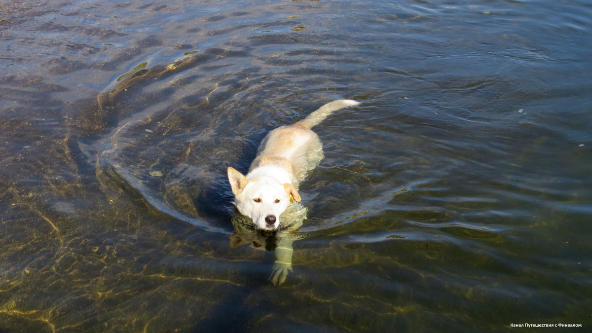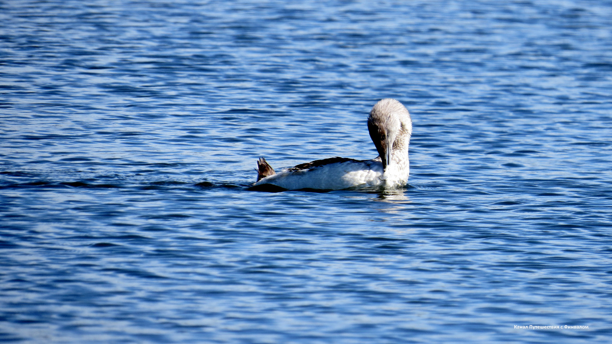 Время от времени очередной пёс, гонимый охотничьим инстинктом, бросается за ней в воду. Гагара спокойно наблюдает, не двигаясь с места. В момент, когда простофиля-«охотник» подгребает достаточно близко, птичка ныряет. Обескураженный собакен тормозит. Вертит мордой. Переплывает речку раз, другой, третий... В это время гагара как ни в чем не бывало выныривает чуть подальше!))) Через несколько заходов до собак доходит, что получить вкусняшку у туристов на берегу гораздо проще, чем "вот это всё"и они теряют интерес к добыче. А непойманная гагара занимает свою прежнюю позицию)).