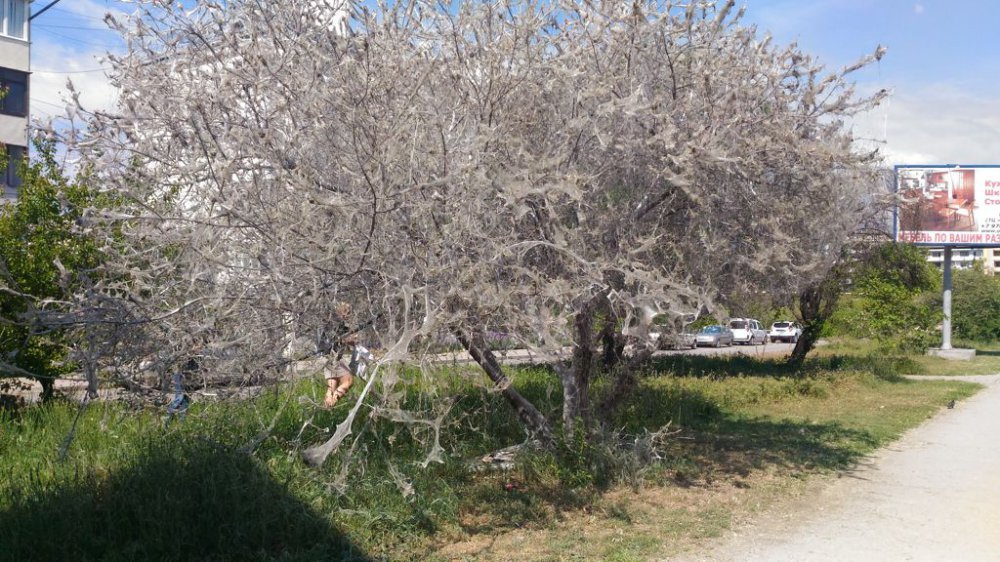 Когда дерево поражено гусеницами очень сильно, оно становится серебристым от большого количества паутины. Ею окутаны не только ветви, но и даже ствол. Данный вид гусениц не поедается птицами, что позволяет вредителям размножаться довольно активно.