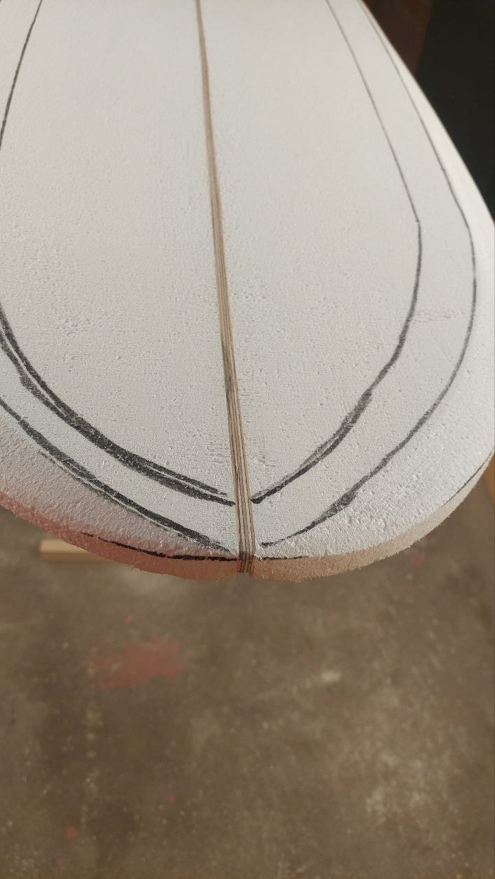 Плавно и аккуратно убираем электрорубанком пену между линией на рейла и ближней линией к рейлу на палубе доски. Пену на носу и хвосте, а также конечную шлифовку я делал 80-й шкуркой сеткой. Важный момент, подготовленные линии вместе с пеной убирать не нужно, они ещё понадобятся на следующем этапе.