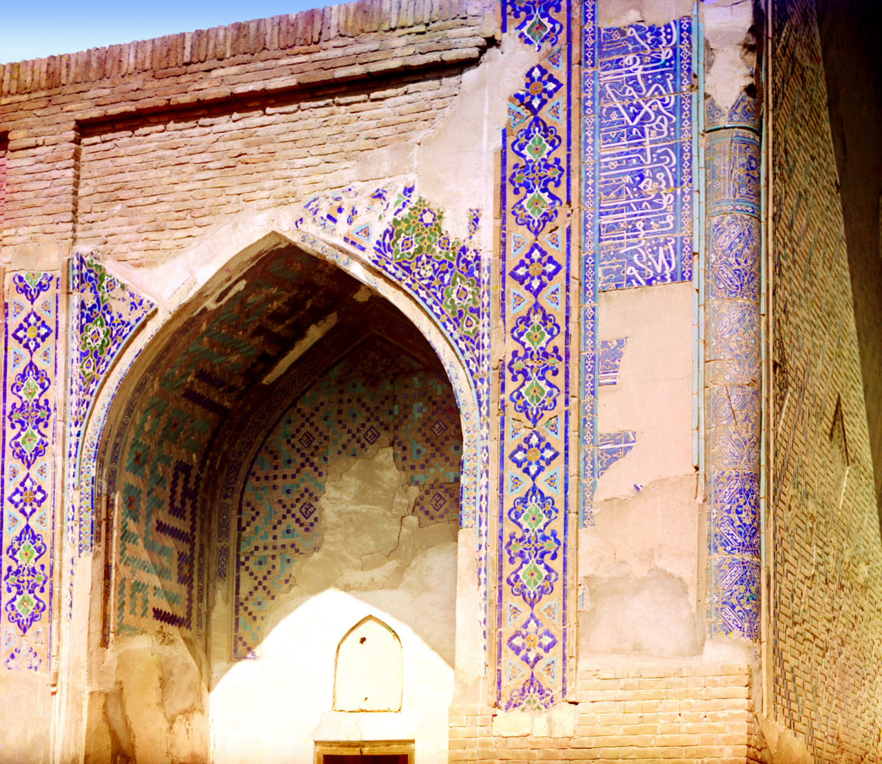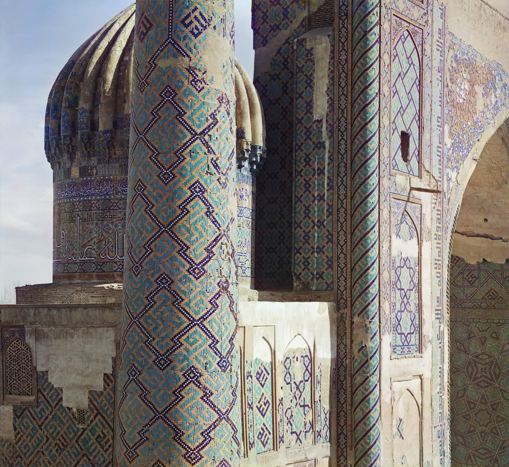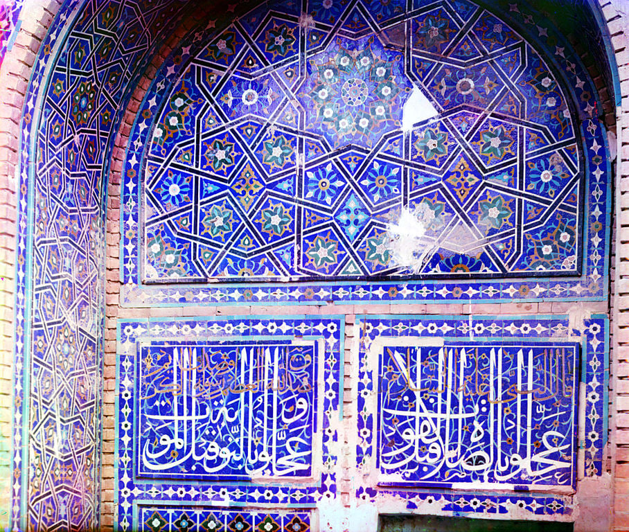 Фото 12 — Образцы мозаичных стен в Шах-Зинде. / [Фрагмент портальной ниши мавзолея Ширин-бек-Ака.]