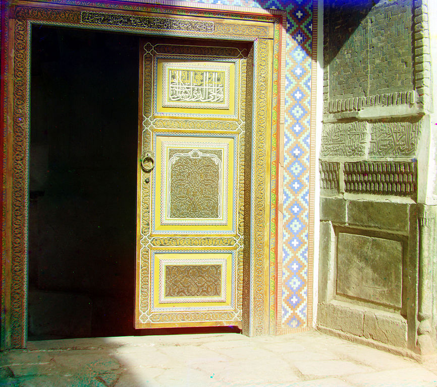 Фото 1 — Часть входной двери с правой стороны Тилля-Кари. Самарканд. (обратите внимание на синий засвет по краям, он появляется из-за особенностей светофиксирующей эмульсии на красной пластине, которой не хватает на балансировку цвета там, где красного нет)