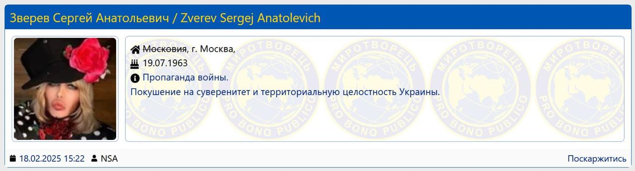 Сергей Зверев внесен в базу украинского сайта «Миротворец»2