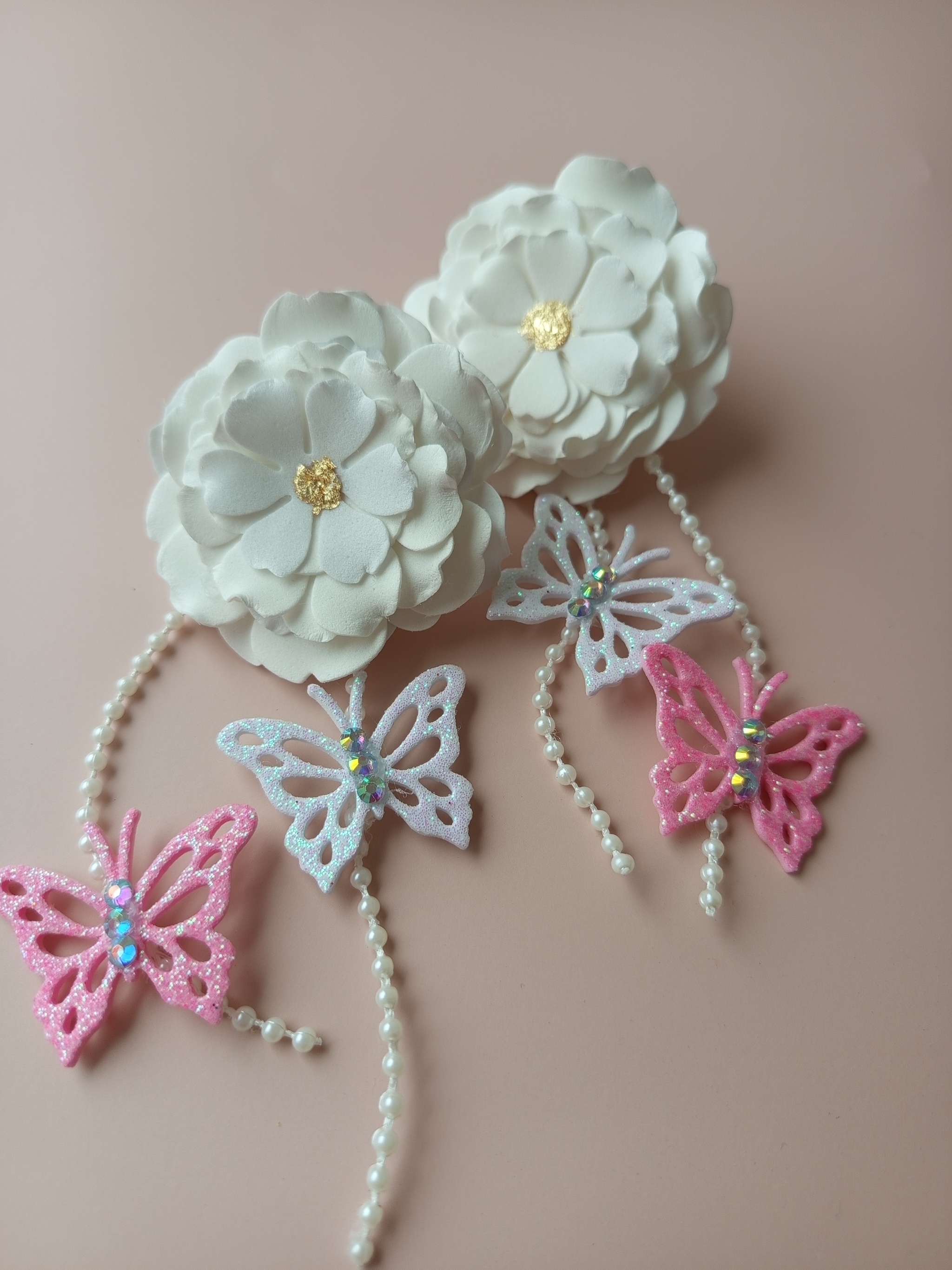 Сделала вторые серьги, хотела белые цветы, еще попробовала добавить бабочек.