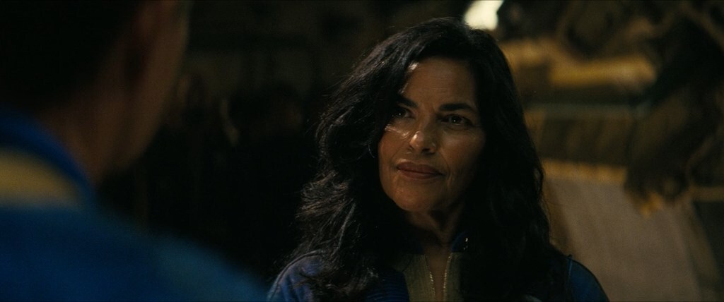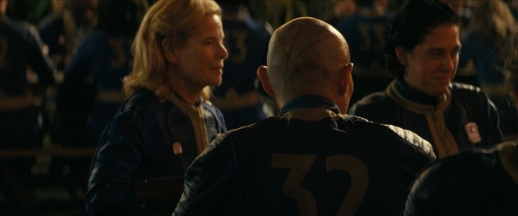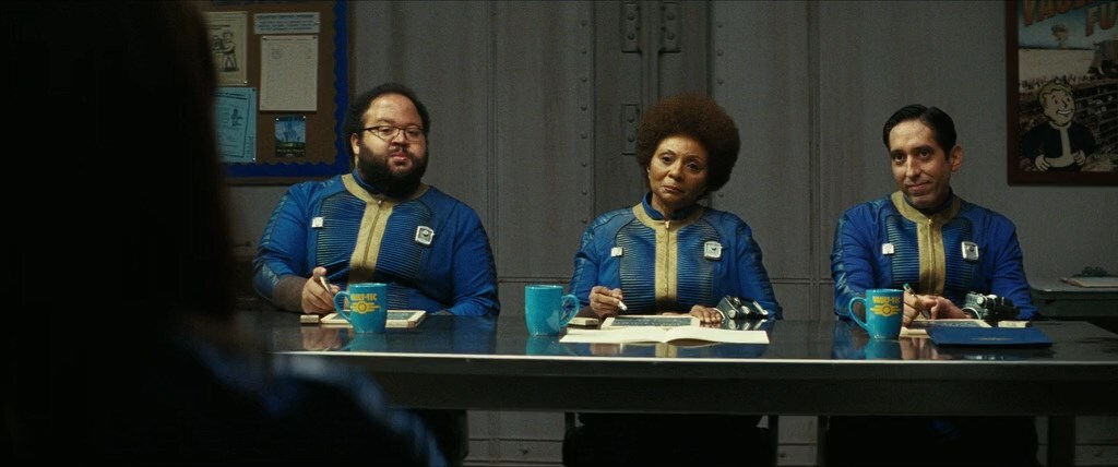 Первое, что меня изрядно подивило – это вот эти трое за столом во время «брачного» экзамена Люси Маклин. Точнее, крайний слева и дама в центре. Насколько мне помнится, согласно лору игры (эта фраза будет ещё не раз встречаться дальше), во всех подземных убежищах, вне зависимости от типа эксперимента, соблюдалась относительно строгая диета с целью протянуть как можно дольше – поэтому вероятность появления бодипозитивных граждан среди жителей убежищ сводилась к минимуму. Правда, жители убежища 33 выращивали кукурузу (кстати, интересно, как она росла под землёй без солнечных лучей? в игре-то она растёт только на Пустошах под открытым небом?) – но какое её количество потребовалось бы для подобного бодипозитива?