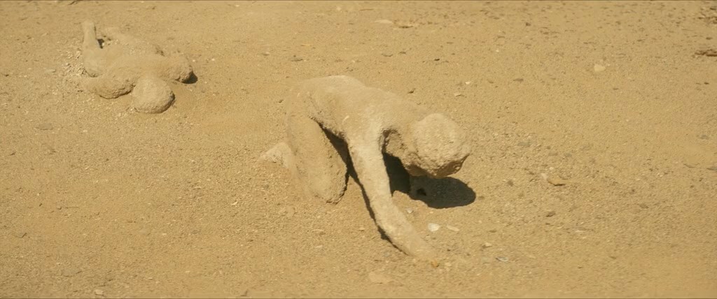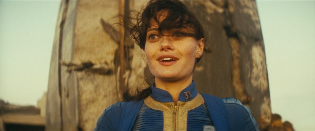 Выйдя из убежища, Люси видит кругом выжженную добела пустыню, полузасыпанные песком останки погибших в результате ядерной бомбардировки людей и полуразрушенные развалины.