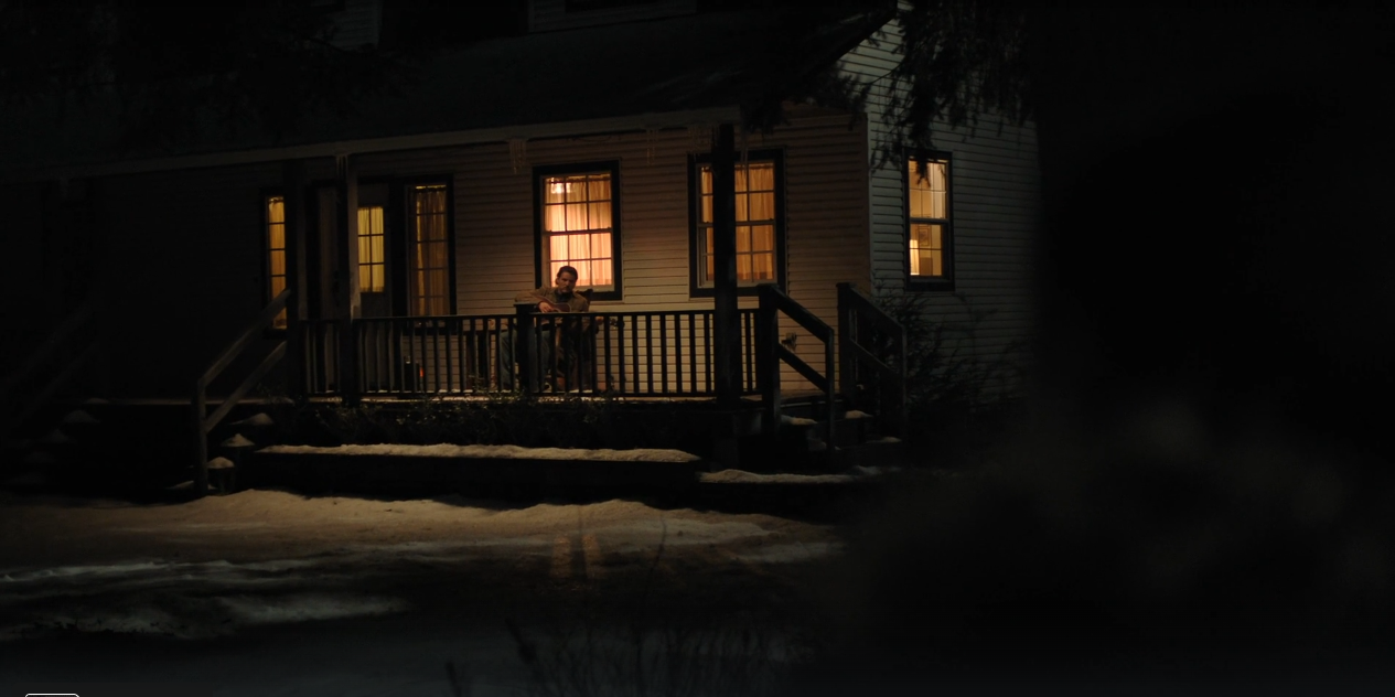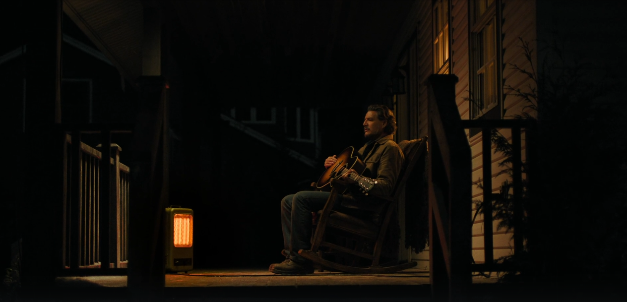 Главный герой сидит на крыльце своего большого дома. В доме никого нет, но там горит свет. А он ради атмосферы решил "побринчать" на гитаре на крыльце. Да чтобы его обогревала электропушка 2-3 квт.