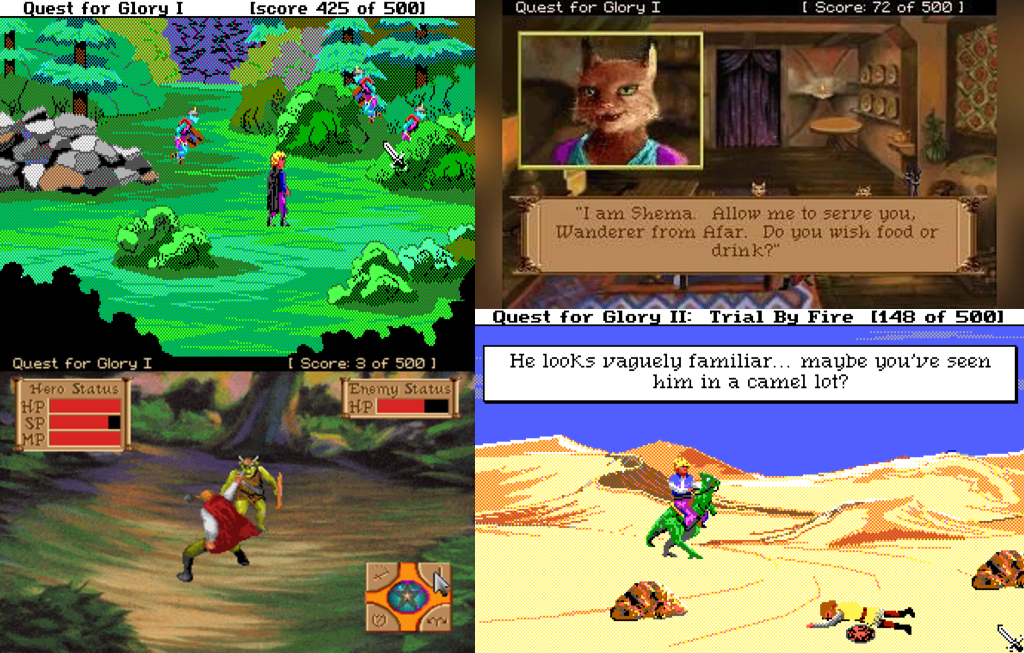 Я недавно упоминал, что хотел бы сделать эту очень необычную серию игр. Предоставляет она из себя смесь классического квеста и внезапно РПГ. Ловите первые 4 части Quest for Glory (также известной как Hero's Quest) для игры в браузере.