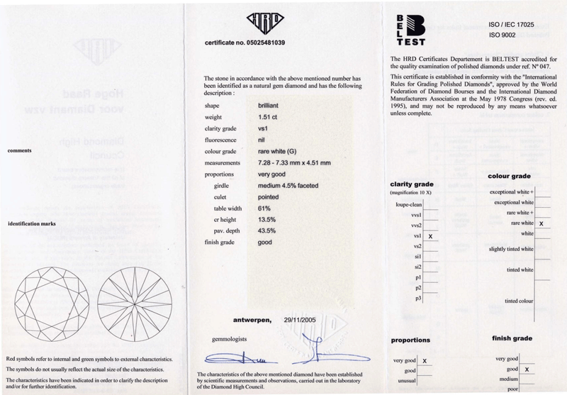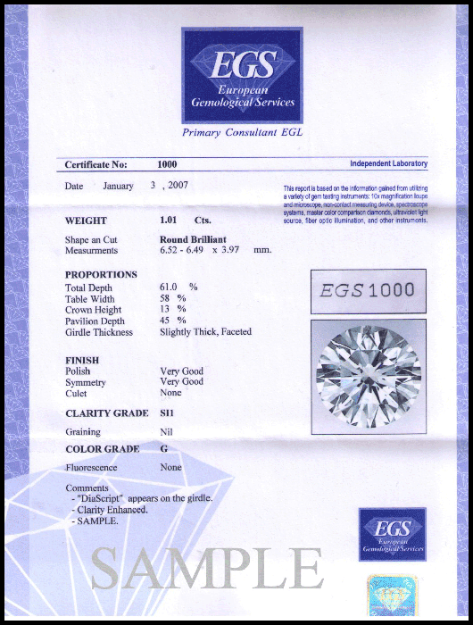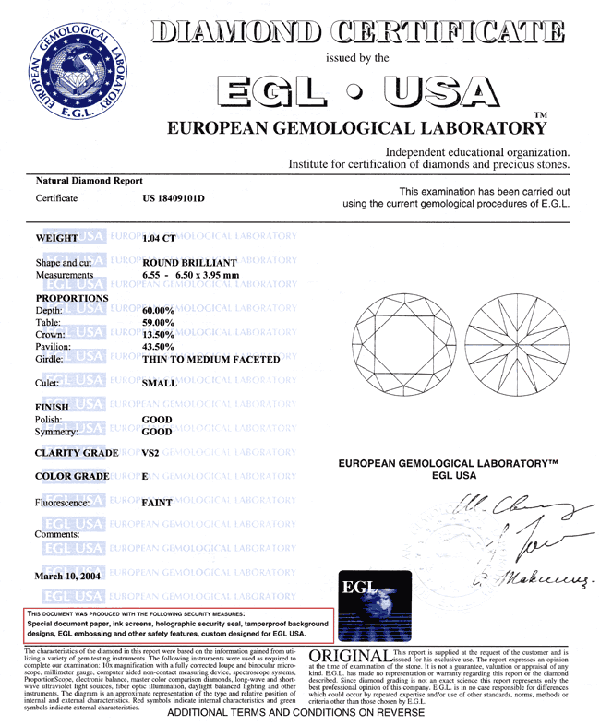 Комментарии: Не указывается флуоресценция, симметрия и пропорции, ценовая оценка соответствует трех-четырехкратной рыночной. Упоминание данного сертификата обозначает сомнительную сделку.