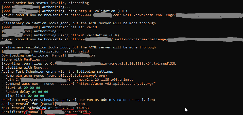 Через без копеек 3 месяца надо будет повторить процесс, но win-acme сохранил данные (кроме паролей), и при запуске надо будет выбирать не "N: Create certificate", а "R: Run renewals".