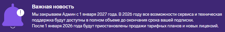 С 1 января 2026 прекращаются продажи тарифных планов, также нельзя будет докупать лицензии. До 1 января 2027 команда Админа будет поддерживать его работу для действующих клиентов.