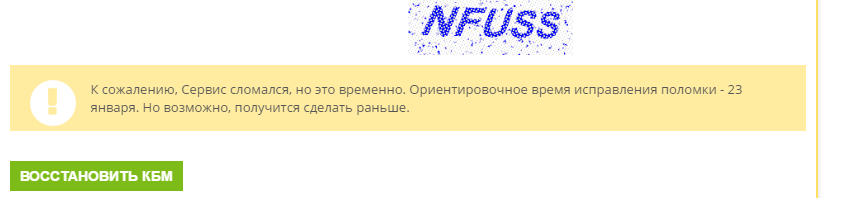 Затем появится действующее значение КБМ и если Вы считаете что оно завышено, вводите еще раз код с картинки и нажимаете [ Восстановить ] или [ Продолжить ] (уже не помню)