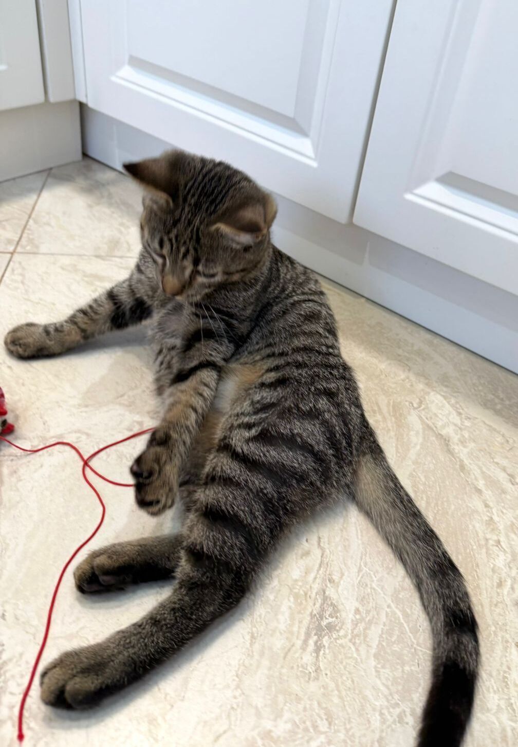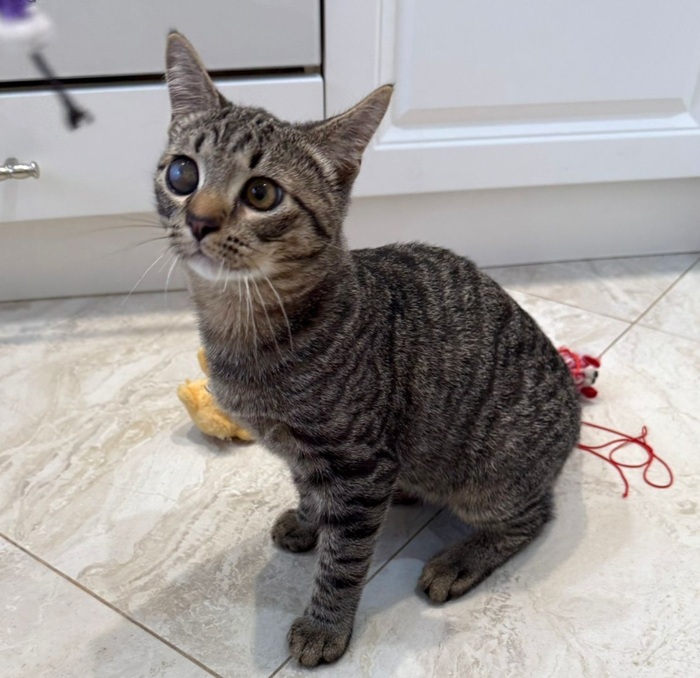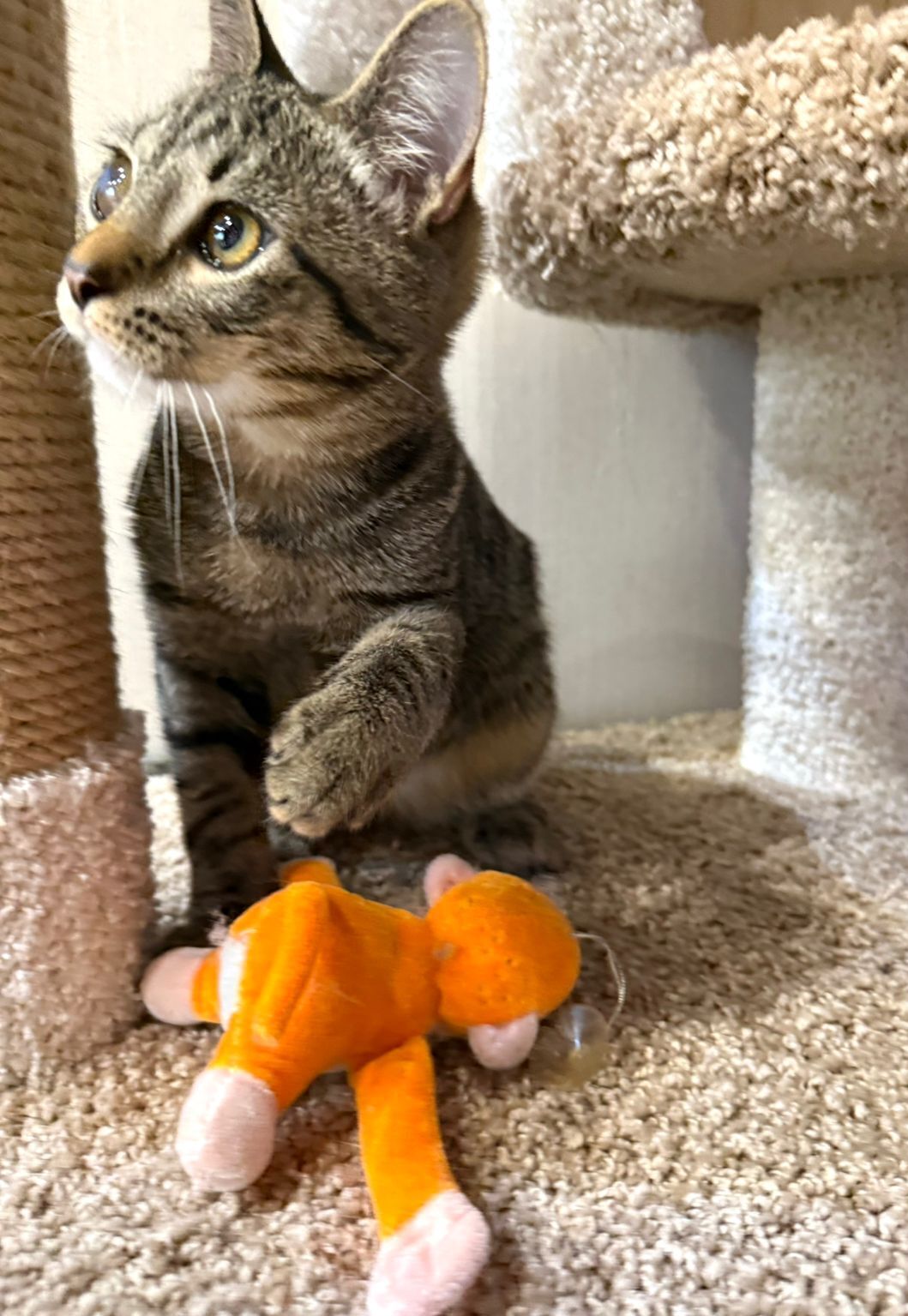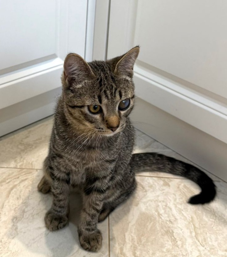 Этот малыш был спасён в 3-х недельном возрасте с улицы в плачевном состоянии. Длительная терапия помогла сохранить один глазик на 100%, но один глазик так и не восстановился. Но это не мешает ему жить активной жизнью и играть с сородичами.
