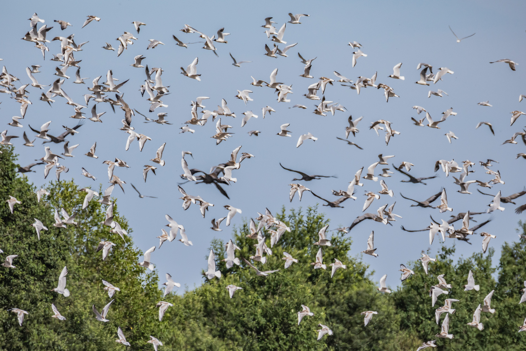 И вот, пока вышедший из кустов я, забыв об осторожности, пытался в объектив сосчитать журавлей на горизонте, одна из таких сторожевых чаек посчитала меня опасностью: не прошло и пары минут, как все чайки, а вместе с ними и журавли, были в воздухе, перелетая на скрытую кустами следующую часть поля.