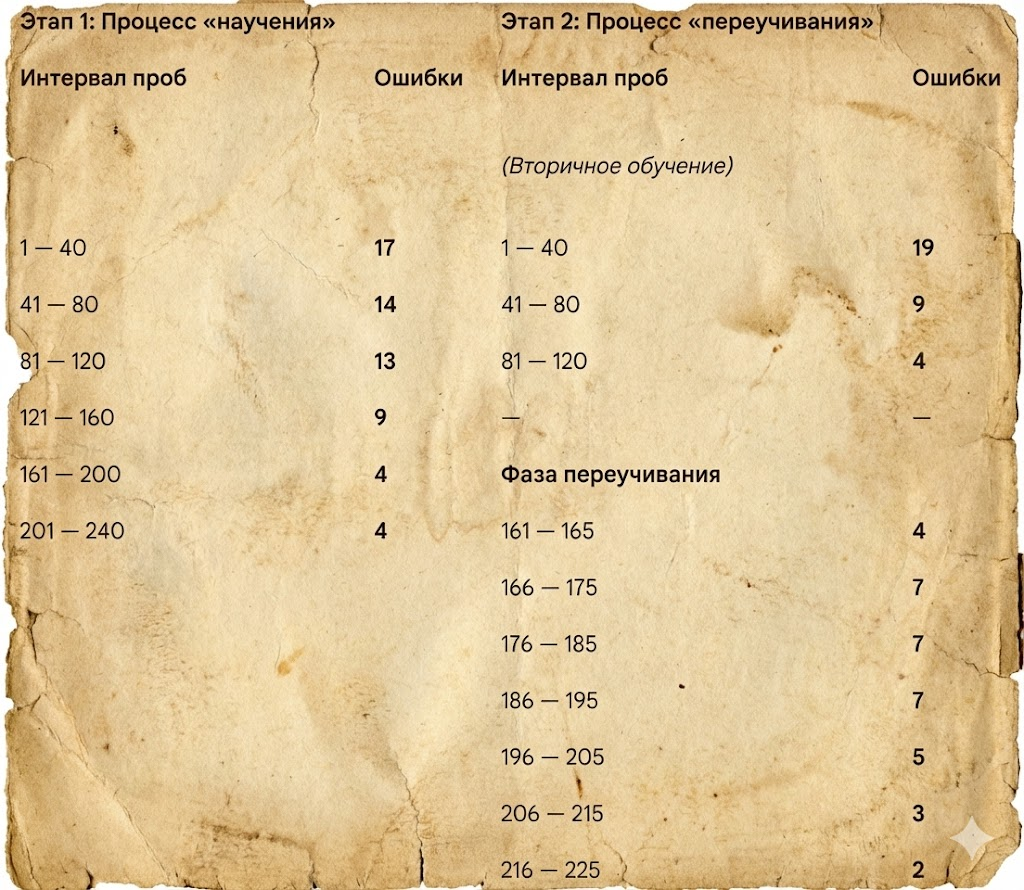 Если повторить этот же опыт после длительной паузы, «обучение» начинает протекать вдвое быстрее, и число ошибок достигает минимального количества уже после 80 опытов. А вот если пытаться переучить червя (в этих опытах червь начинал получать электрический шок уже не слева, а справа), то возникнут проблемы. Этот процесс протекал значительно медленнее, и хоть какой-то эффект «переучивания» появлялся после 200 проб.