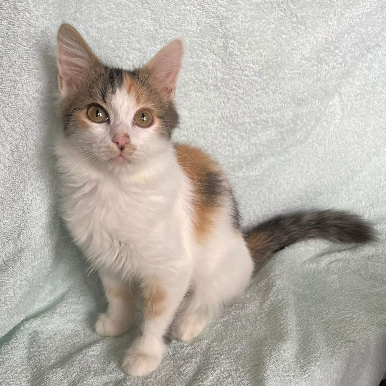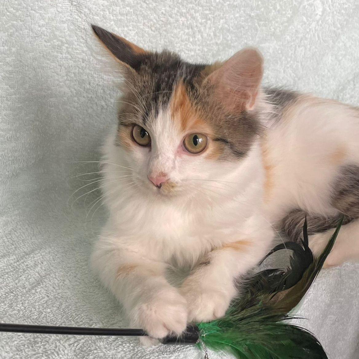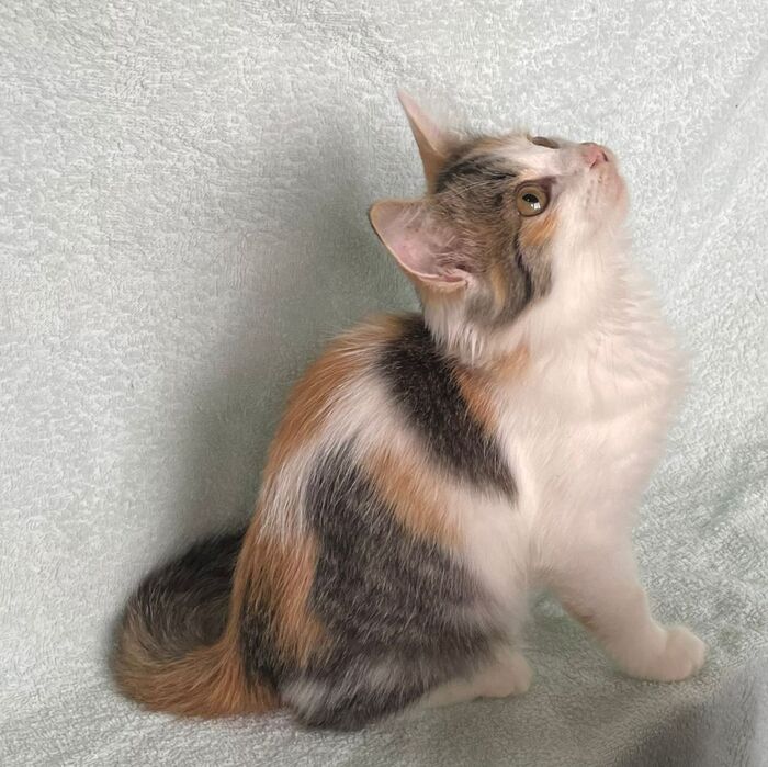 Айве около 3-х месяцев, может, чуть меньше. Она очень ласковая, человекоориентированная кошечка, любящая гладиться и играть.