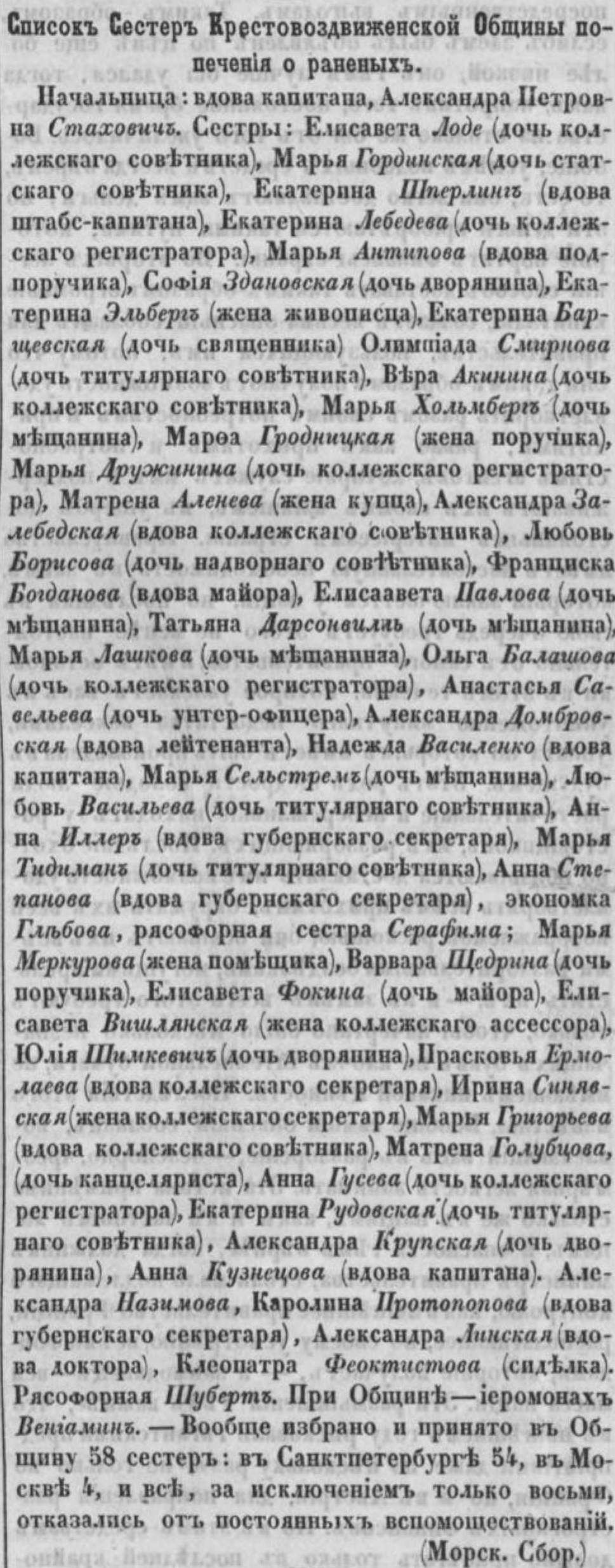 Я видел, как приехали эти героини в Симферополь, видел даже и первоначальные их действия при раненых, особенно во время операций. Я видел то, чему бы никак не поверил, если бы не удостоверился собственными глазами — видел истинное геройство. Это были дамы и девицы различного возраста,большею частью из благородного сословия, которые добровольно явились к Ее Высочеству Елене Павловне на Её предложение «ехать в Севастополь» и избраны из большего числа «желающих» по самым верным, безукоризненным рекомендациям.