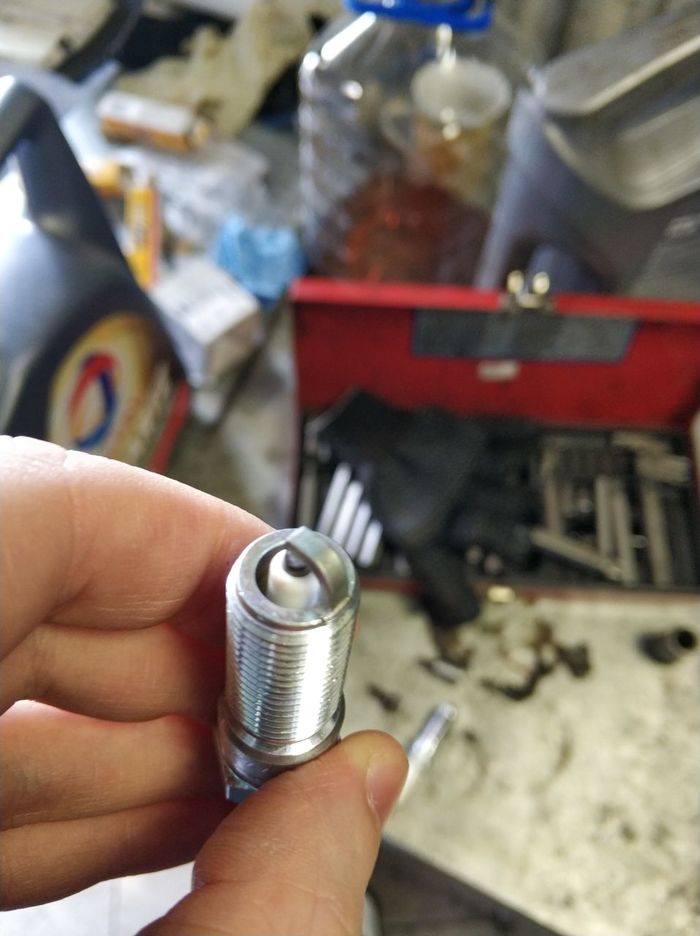 Мастер достал осколки изоляции свечей из двигателя (неизвестно все или нет) и произвел замер давления клапанов. Он сделал вывод, что свечи лопнули то ли из за брака то ли из за низкого давления (очень странное заключение). Сам я произвел осмотр разбитых свечей и обнаружил что кончики были поцарапаны и погнутыми. На фото может не видно, но они потертые.