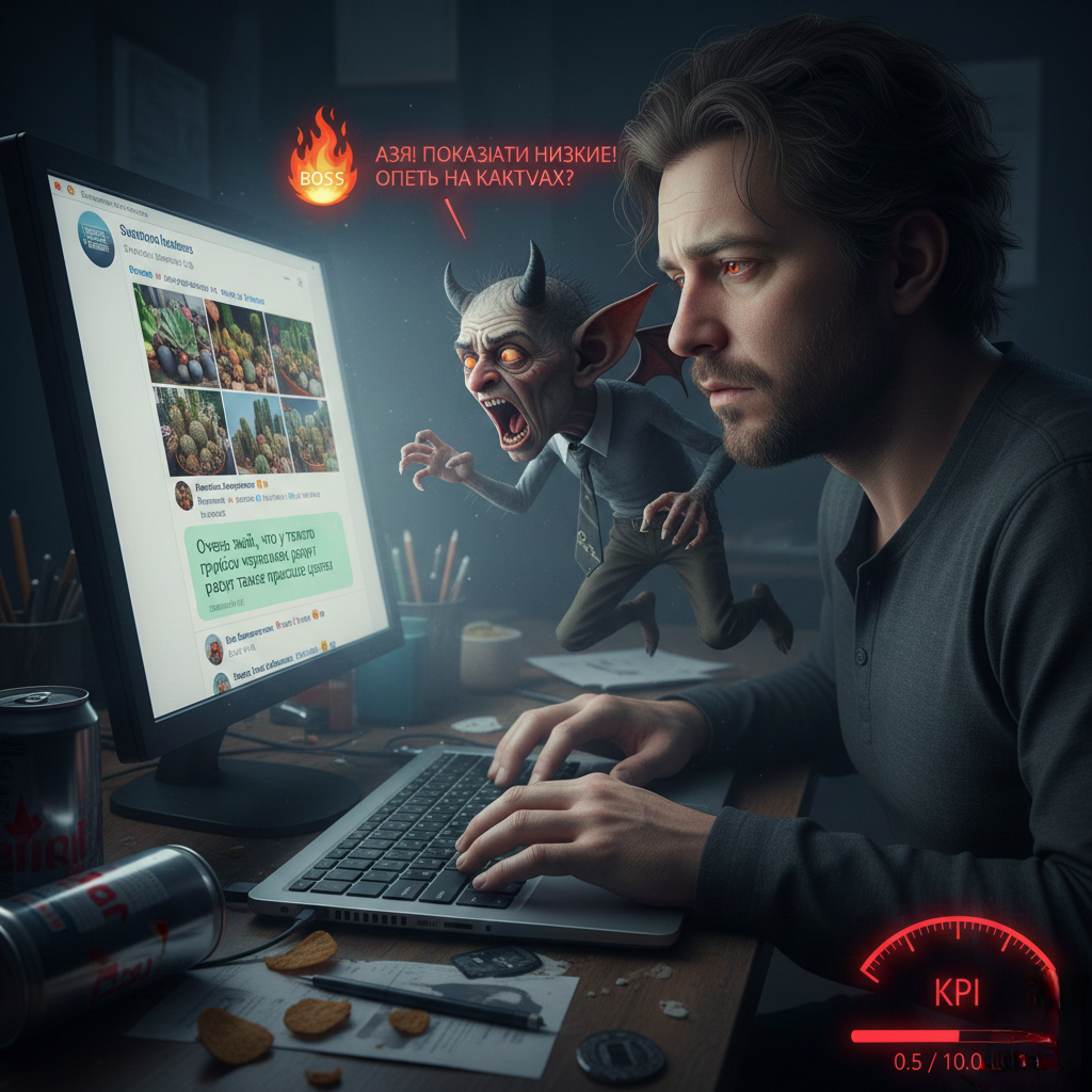 В аду есть план по «единицам произведенной желчи». Если я не заставлю Антона пожелать этой женщине сгореть в очистительном пламени из-за суккулента, меня лишат квартальной премии. А премия в моем отделе — это сорок минут тишины без криков «Я же говорила!» из соседнего департамента семейных ссор.