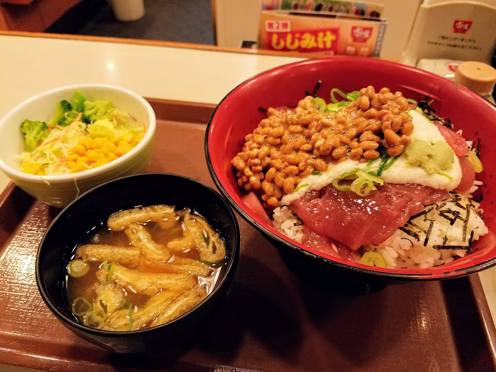 Ямакакэ тэкка дон - рис с сырым тунцом (двойной порцией за отельную плату) и давленой картошкой с васаби сверху. Натто, это я отдельно купил. Есть также разные наборы с разными супами и салатами. Этот не самый дешёвый заказ стоил 1250иен (600р)
