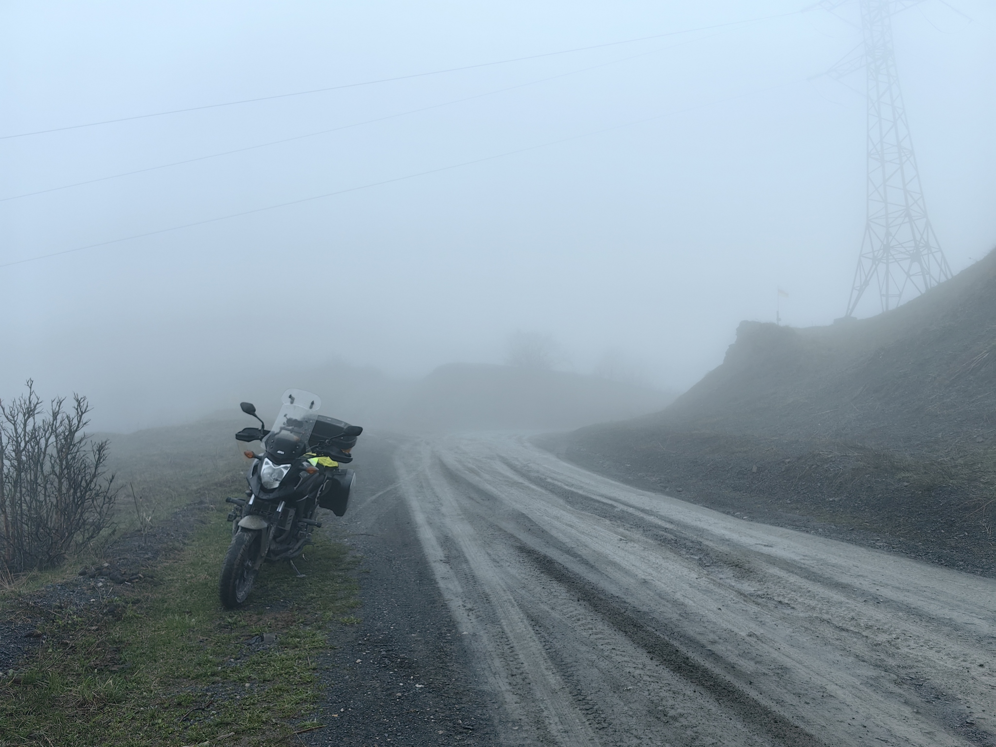 Чем дальше, тем интереснее! На пути одной из самых высоких точек будет Архонский перевал (42.831182, 44.212334). Наверное здесь очень красивый вид, но в моём случае был непроглядный туман и дождь, поэтому оценить красоту не получилось. Зато получилось проникнутся атмосферой таинственности и полного единения с собой. Ведь перед тобой, сбоку, сзади везде белая пелена и небольшой кусок дороги уходящий в никуда.