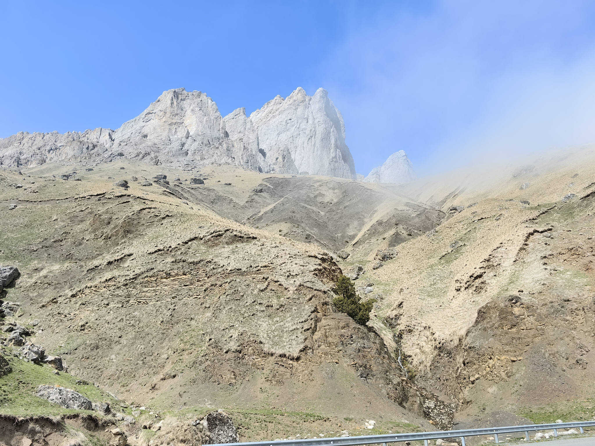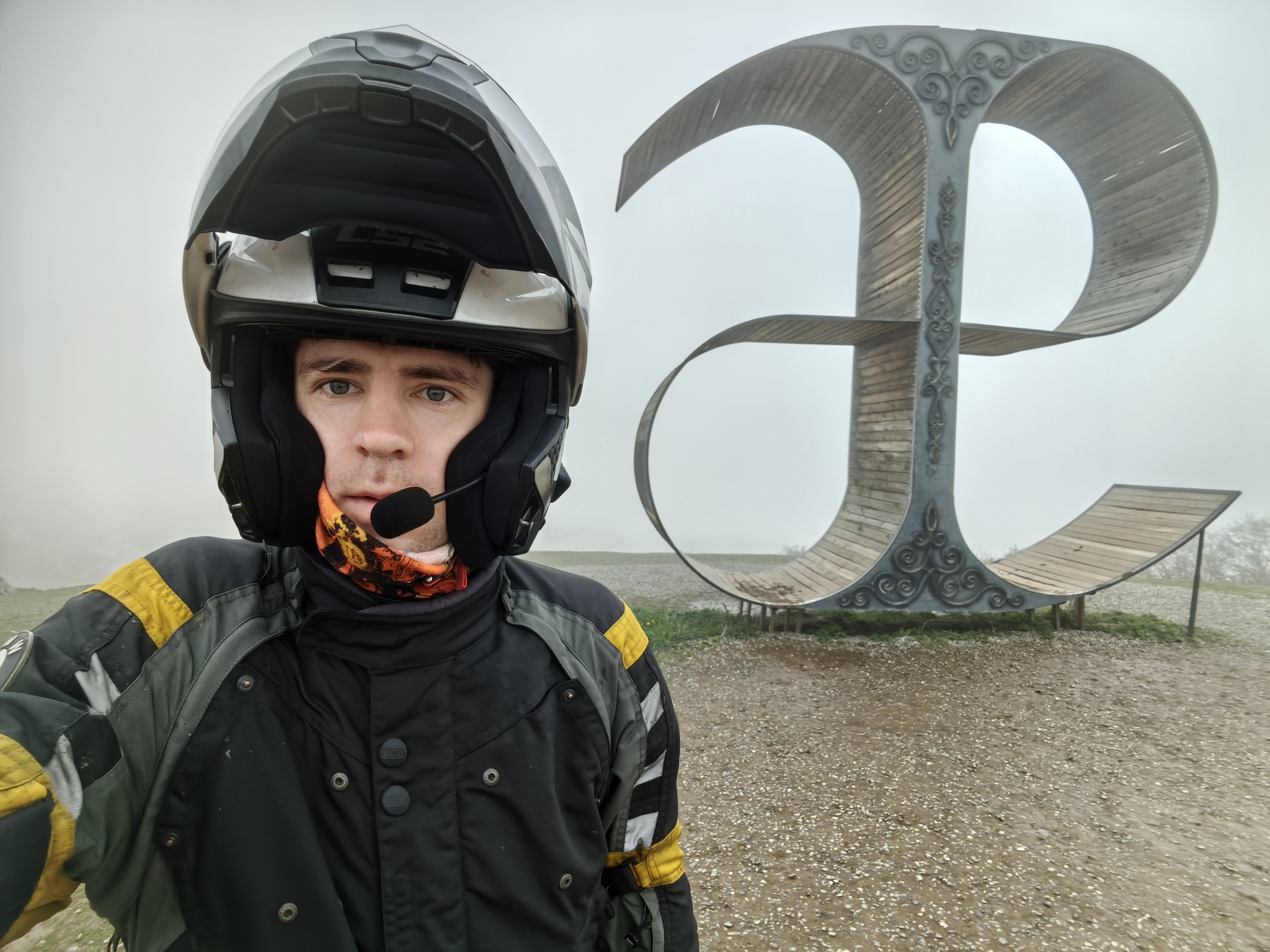 Ночью были потрясающие виды на освещённые луной скалы, а позже накрыл ливень с грозой, что в горах это воспринимается особенно ярко! По утру погода менялась каждые 30-60 минут: то туманом затянуло, то солнце шпарит, то дождик идёт. На ноте таинственности (то бишь тумана) я выдвинулся дальше. Прямо у дороги есть интересная достопримечательность "Буква АЕ" (42.834843, 44.349004)