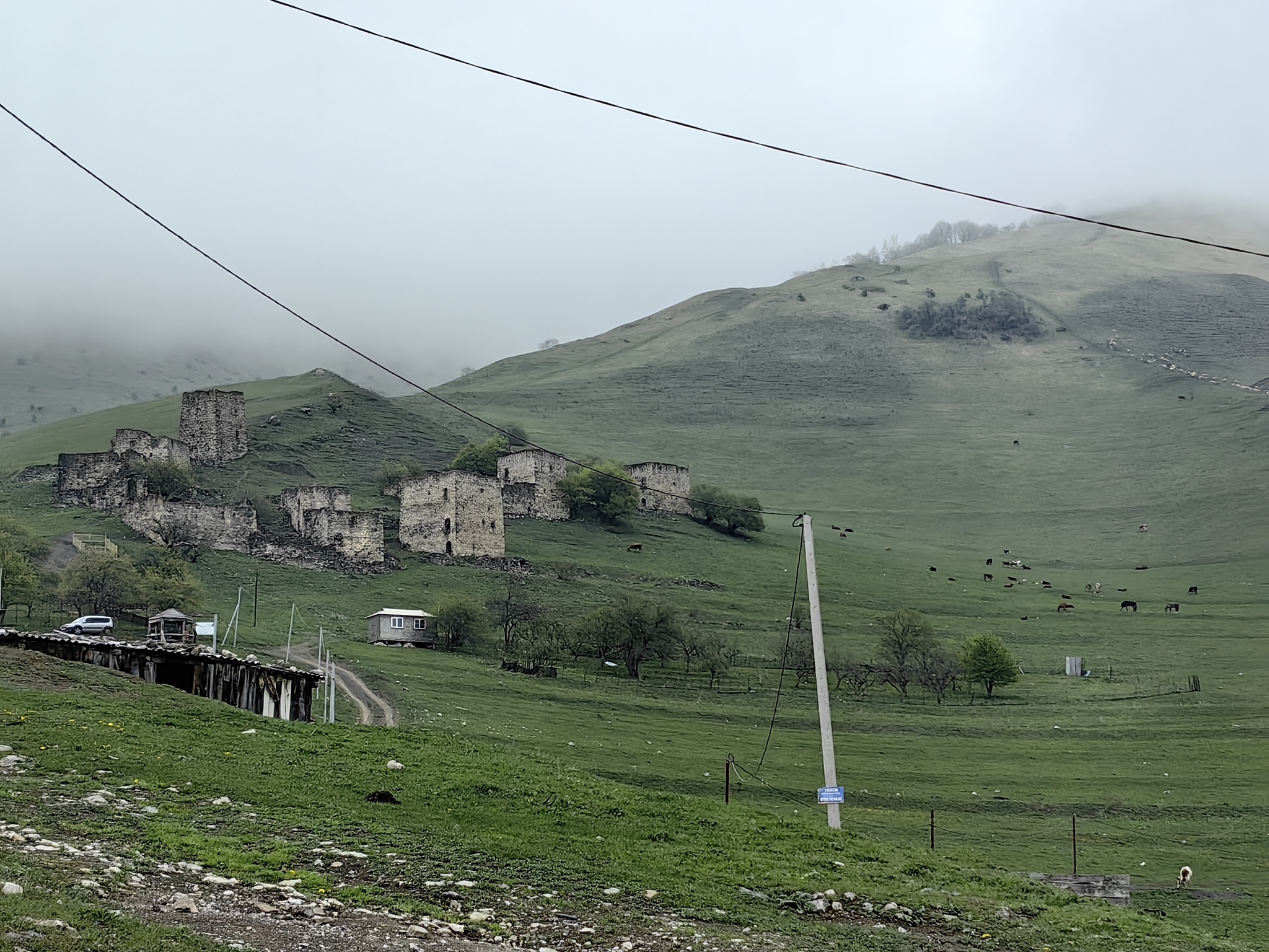 Здесь можно повернуть на Мидаграбинские водопады (42.760114, 44.365260). Если поехать дальше в сторону Кармадона, то рядом с посёлком Даргавс находится разрекламированное место "Город мёртвых" (42.841149, 44.445691), но рядом с ним опять же куча ларьков, автобусов с туристами и попрошаек. Сама идея, что за проход на кладбище собирают деньги мне уже кажется кощунственной, плюс есть куча других мест, где можно посмотреть аналогичные башни.