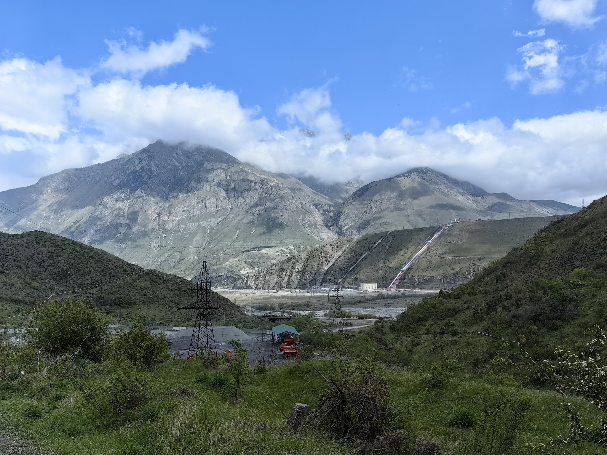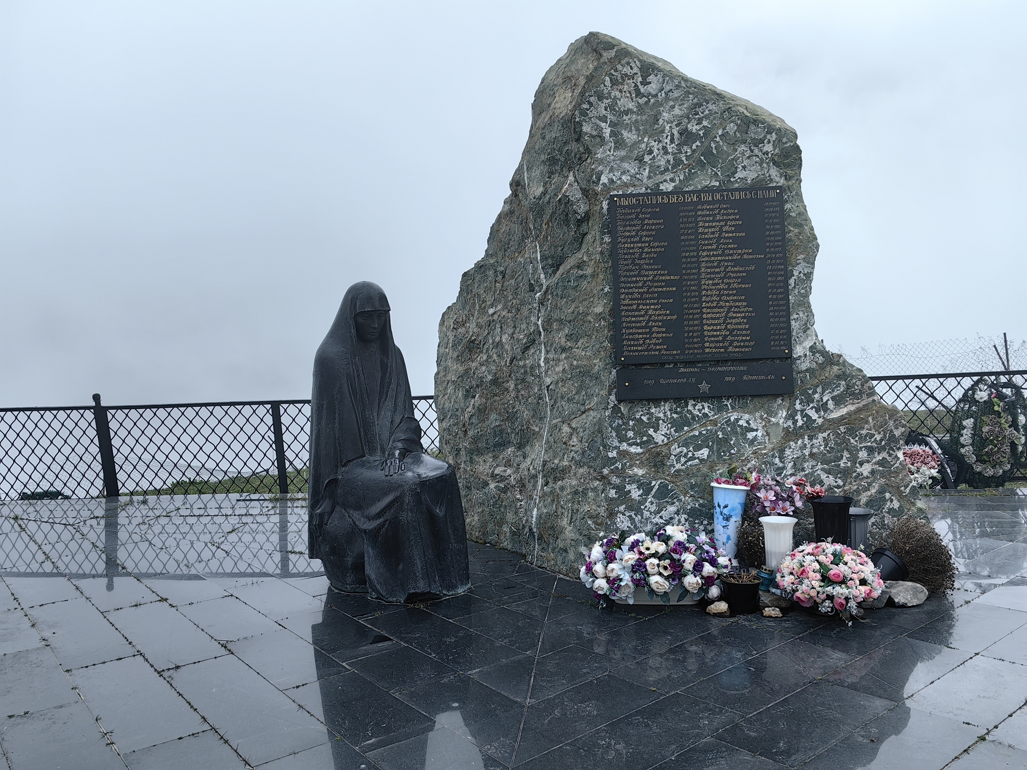 Сворачиваем направо и едем в сторону Кармадона. По пути как обычно куча смотровых площадок и просто приятные виды. Если есть желание проникнутся всей болью людей, потерявших своих близких в Кармадонском ущелье во время схода ледника Колка 20 сентября 2002 года, то советую доехать до памятника "Мать скорбящая" посвящённого Сергею Бодрову и съемочной группе (42.859269, 44.515635).