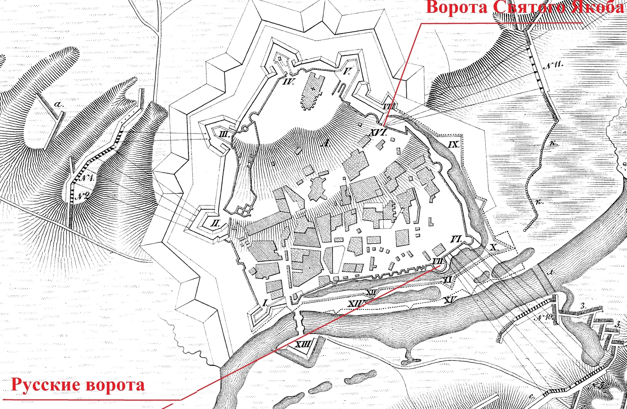 После обстрелов Русских ворот 6 и 7 июля, башня над ними была снесена до основания. В ночь на 10 июля осаждающие провели траншеи от ворот Святого Якоба практически до реки. К вечеру 12 июля был готов мост через Амовжу. Это при том, что Петру «все не понравилось». «здесь обрели мы людей в добром порядке, но кроме дела, ибо две апроши с батареями принуждены бросить, за их неудобством, третью переделать и, просто сказать, кроме заречной батареи и Балковых шанец, которые недавно перед приездом нашим начаты, все негодно и в туне людей мучили» - писал он Меншикову.